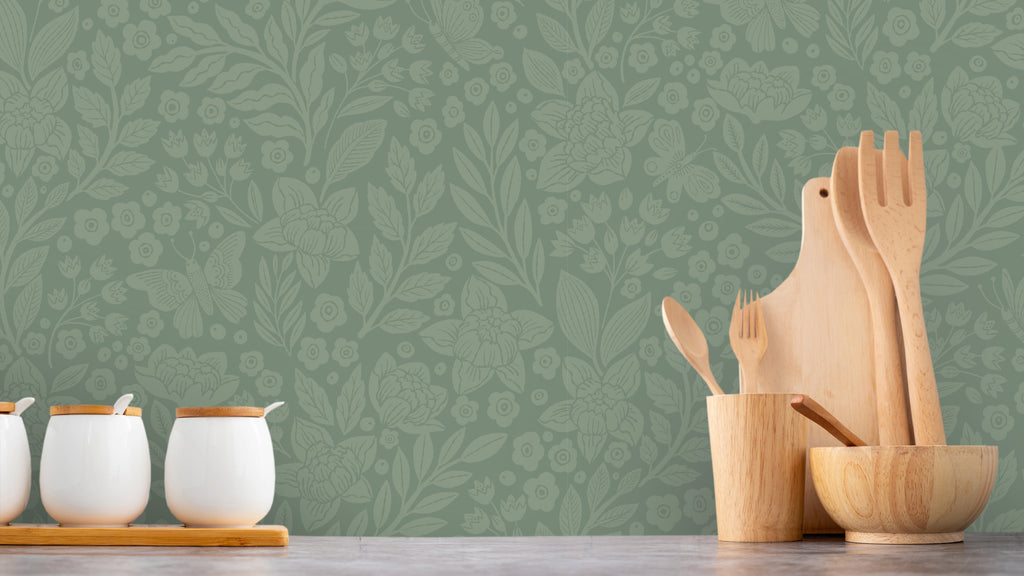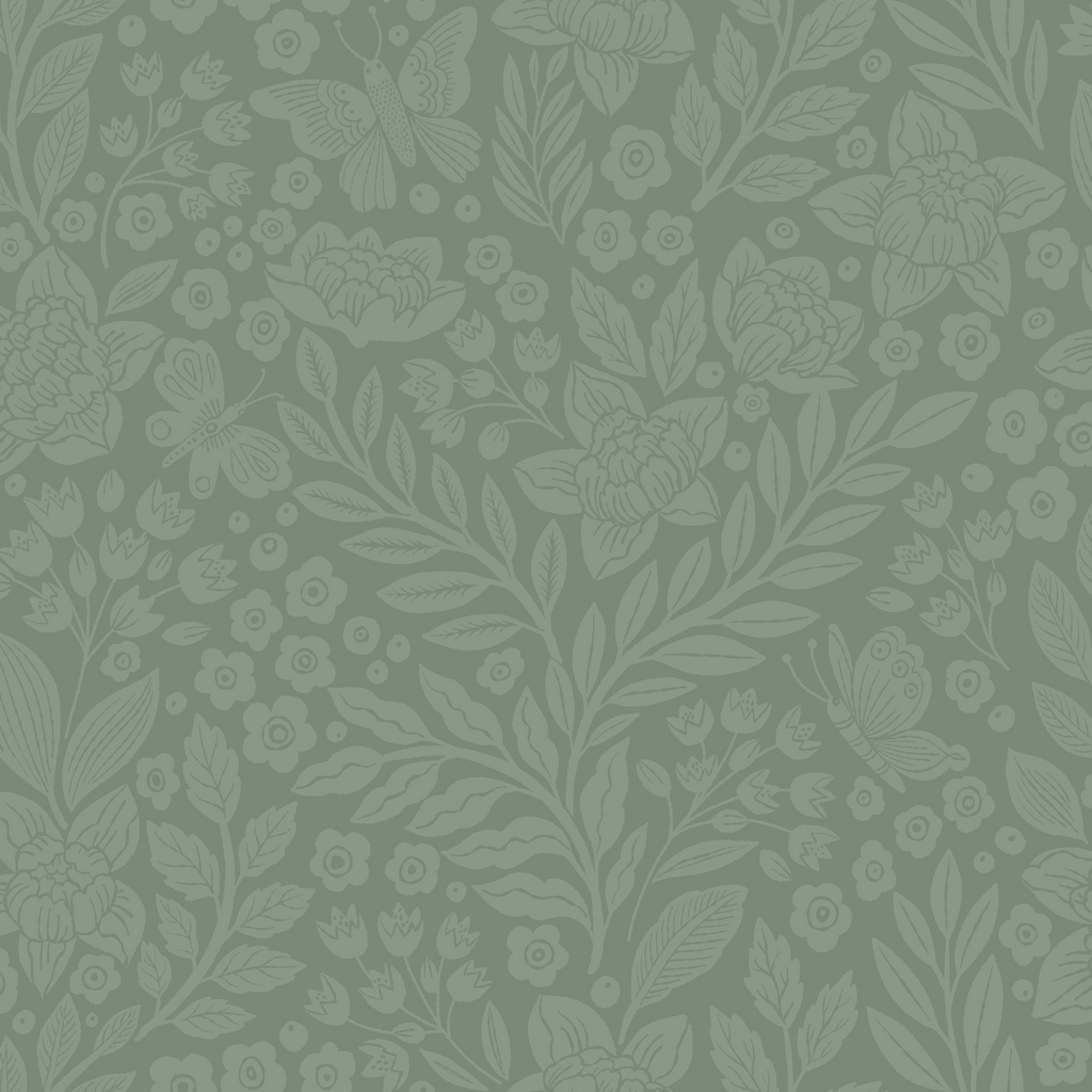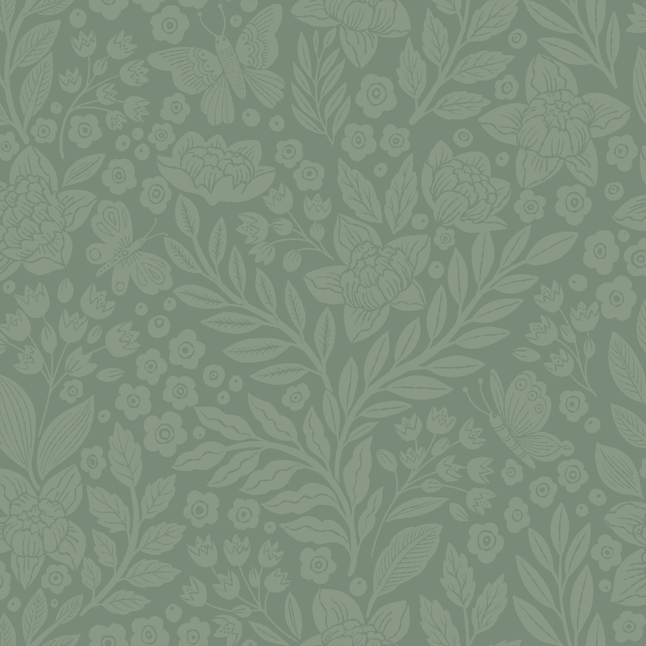 Butterfly Garden är en romantiskt blommig tapet som kommer att förtrolla ditt hem med sin vackra och livfulla design. Tapeten är dekorerad med en mängd olika blommor, blad och kvistar i skiftande storlek och karaktär, vilket ger en helt unik och försiktigt färgsprakande inredningsdetalj.