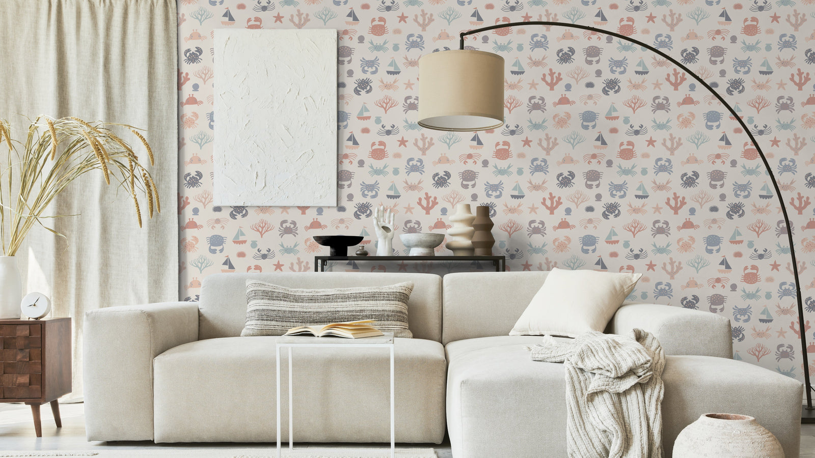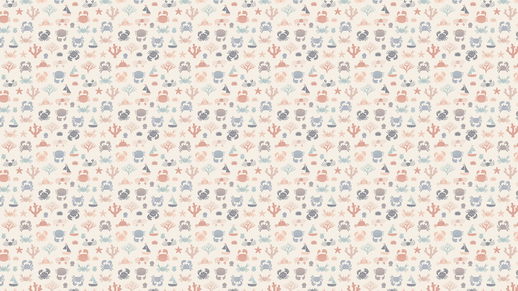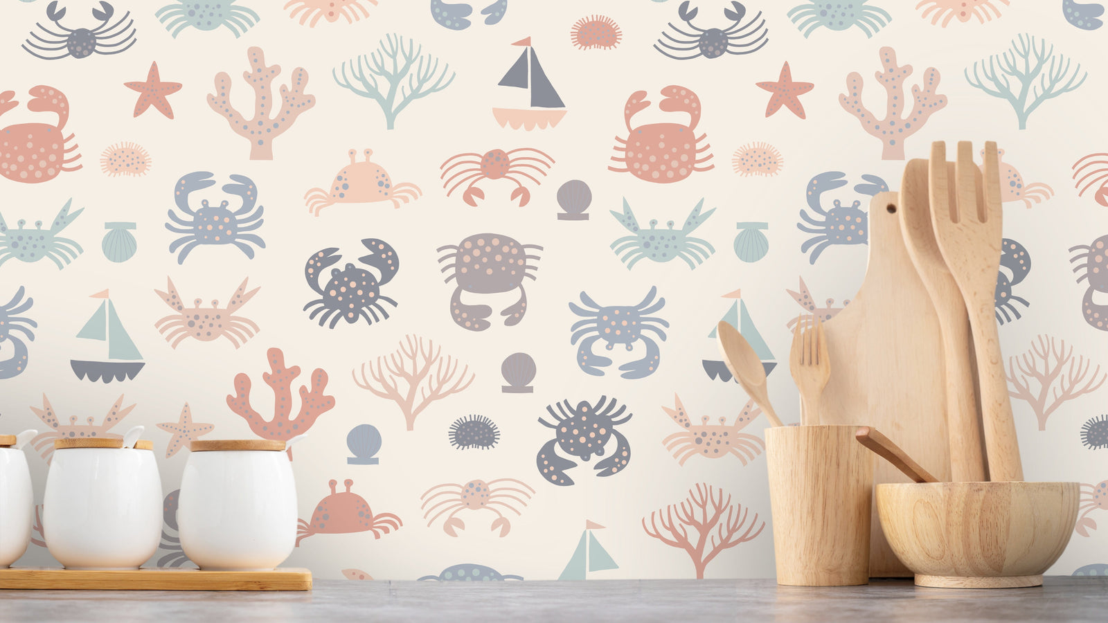 Crab Beach är en lekfull och inspirerande tapet med en härlig marin känsla. Med skaldjur som huvudrollsinnehavare blir tapeten till ett unikt och roligt tillskott till vilket rum som helst. På tapeten syns ett flertal olika skaldjur i varierande storlek och färg, allt från stora krabbor till små räkor.