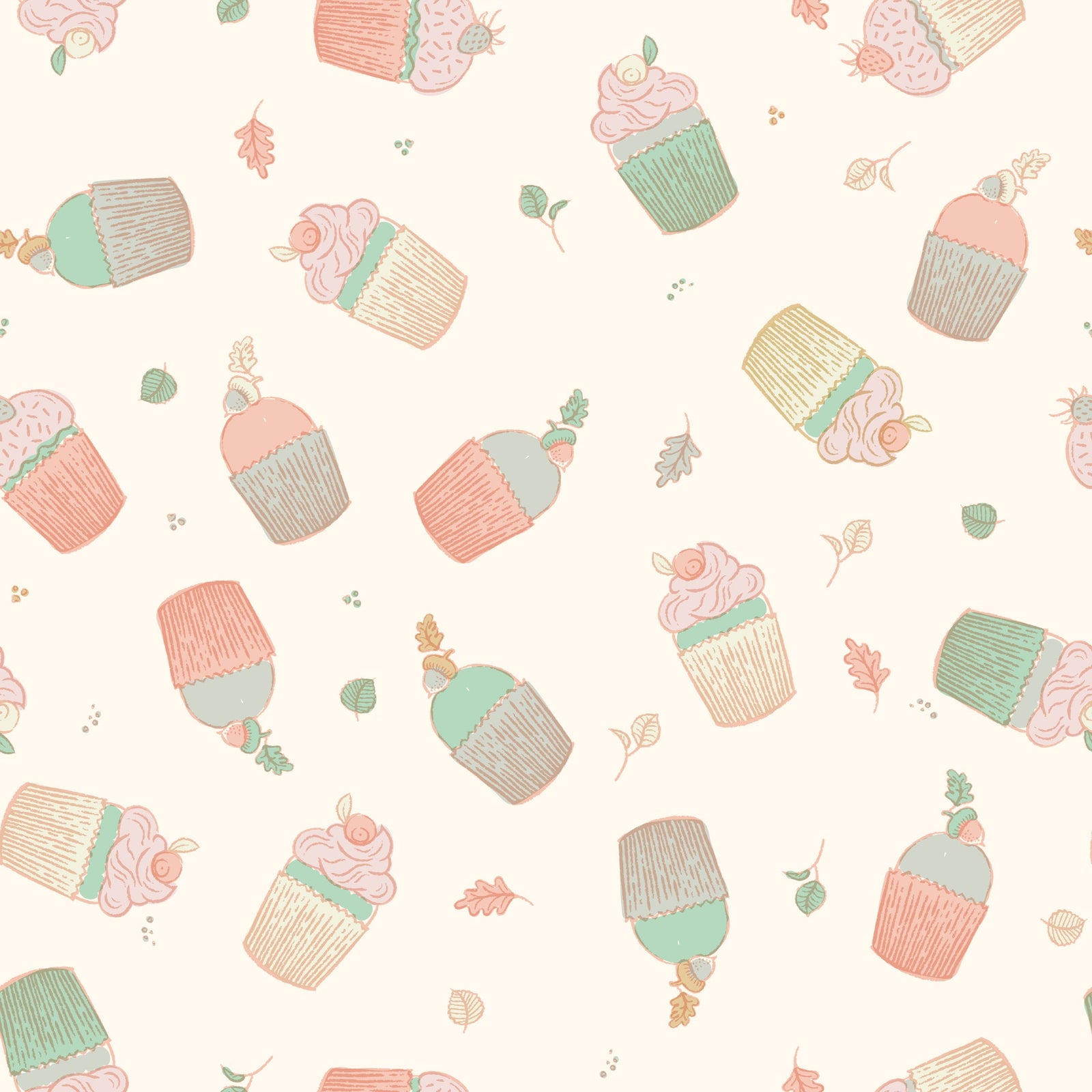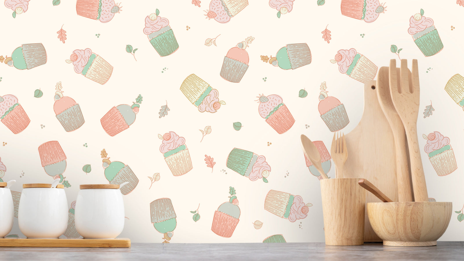 Cupcakes - Flygande cupcakes är en söt och lekfull tapet som passar perfekt för alla som vill ha lite extra söthet i sitt hem. Tapeten är fylld med illustrationer av cupcakes som svävar runt i luften, omgivna av små blad. Det är som att du har ett eget litet sockerbageri på din vägg.