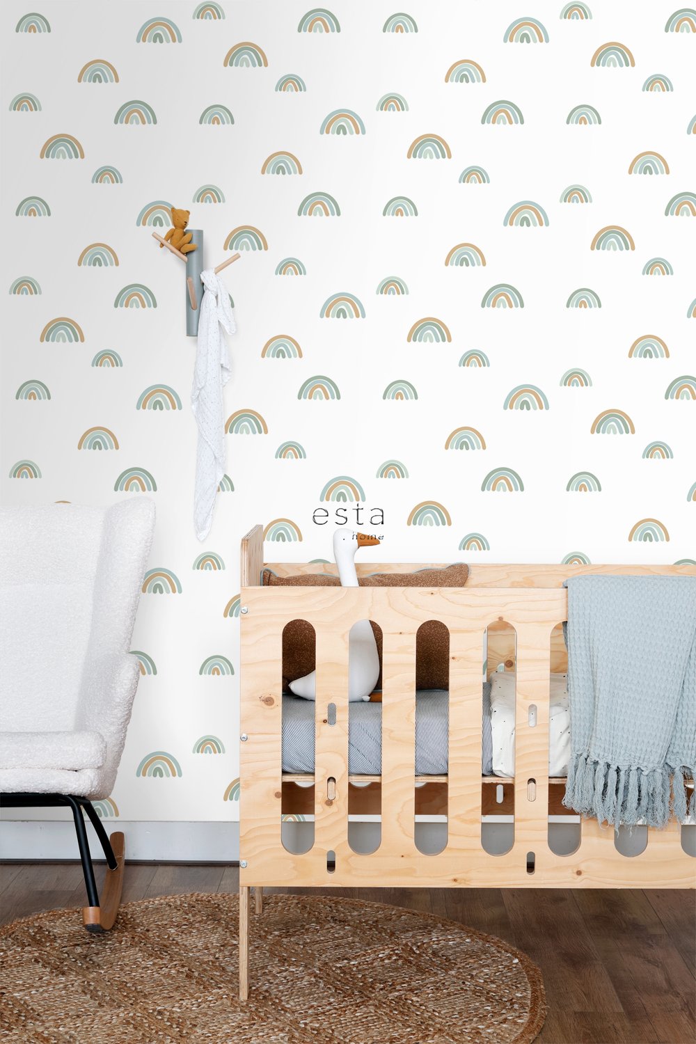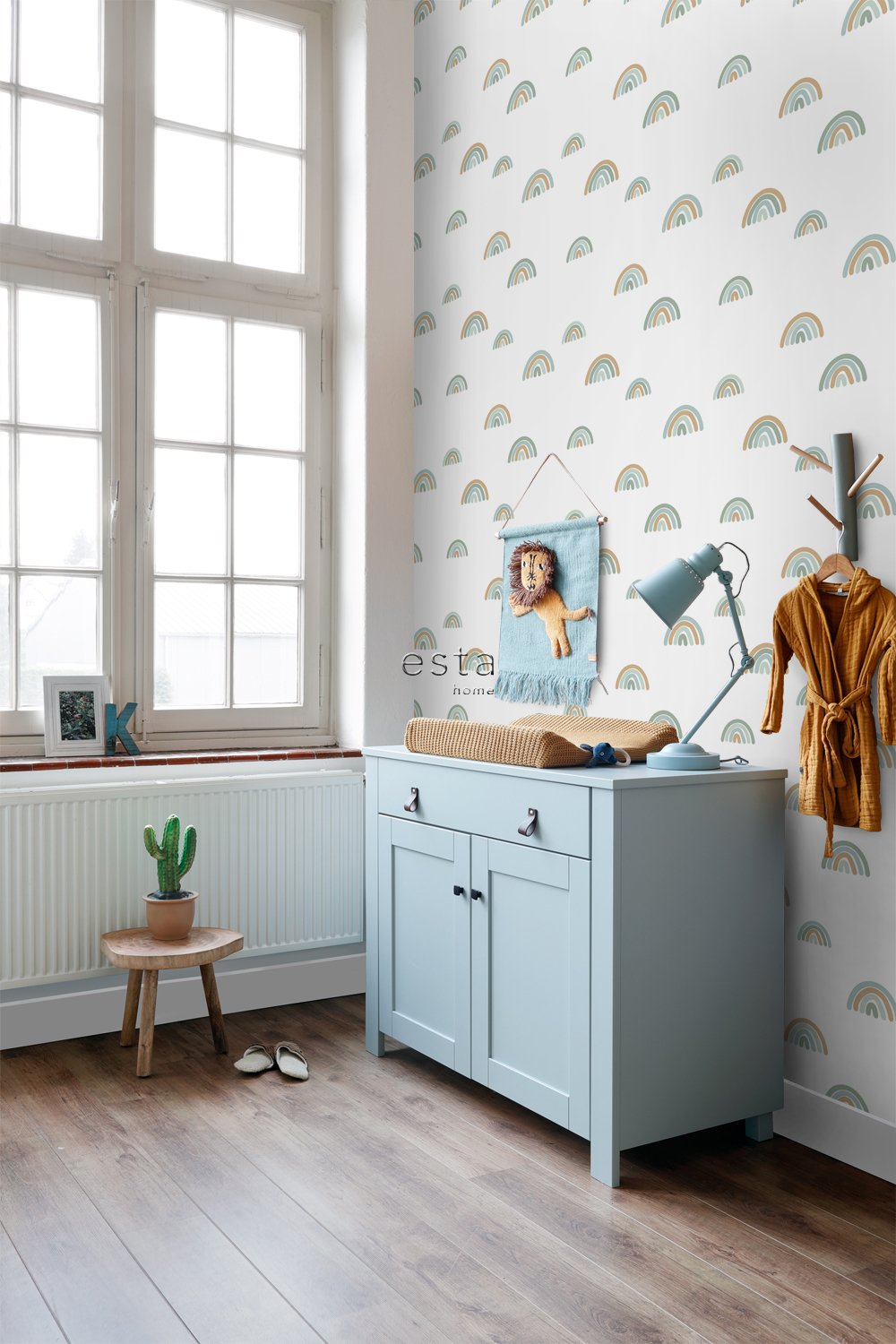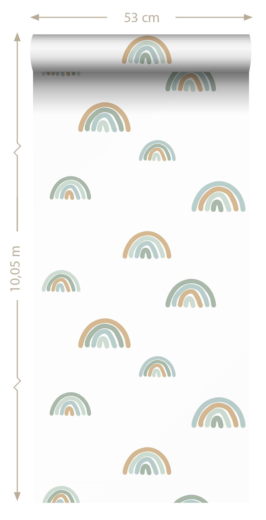 Har du någonsin sett något så gulligt? Den här gulliga tapeten med regnbågar i vintage gråblått, ljusblått och beige ger en varm, glad och livfull stämning i barnrummet. Släpp loss din och dina barns fantasi och skapa ett fantastiskt rum att drömma och leka i.