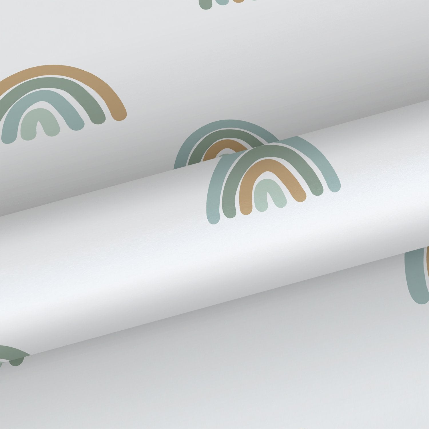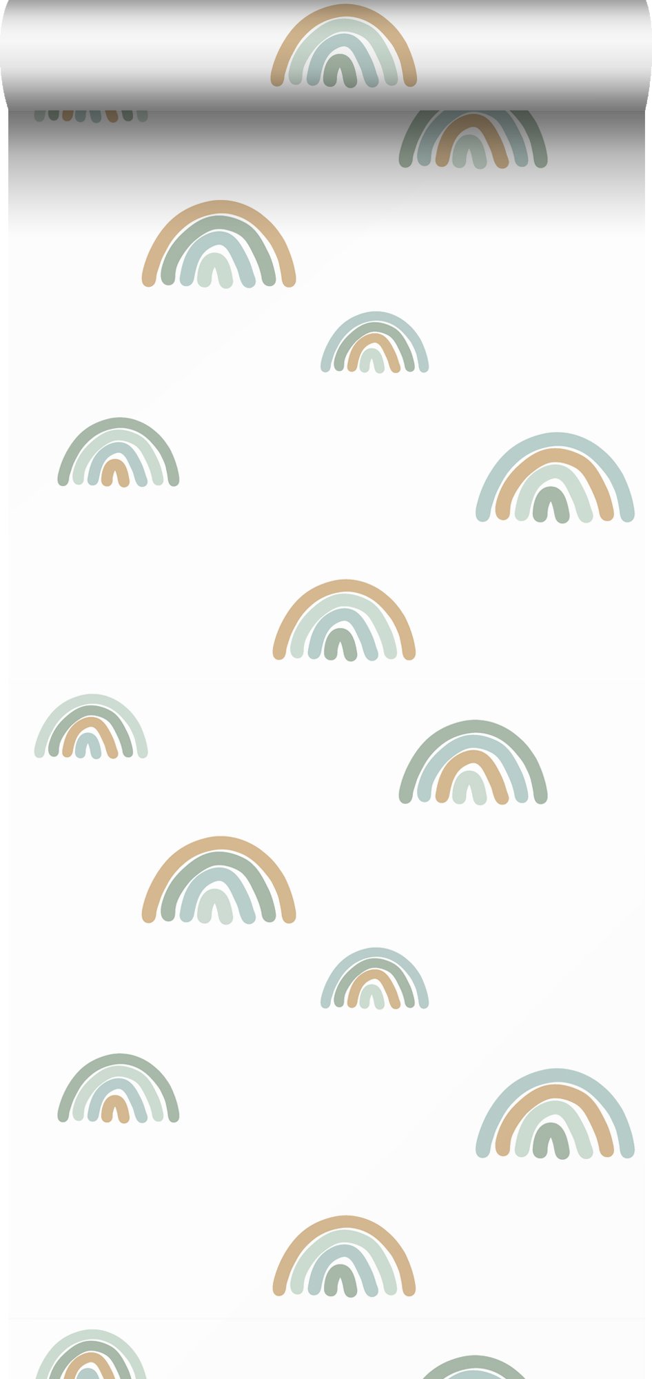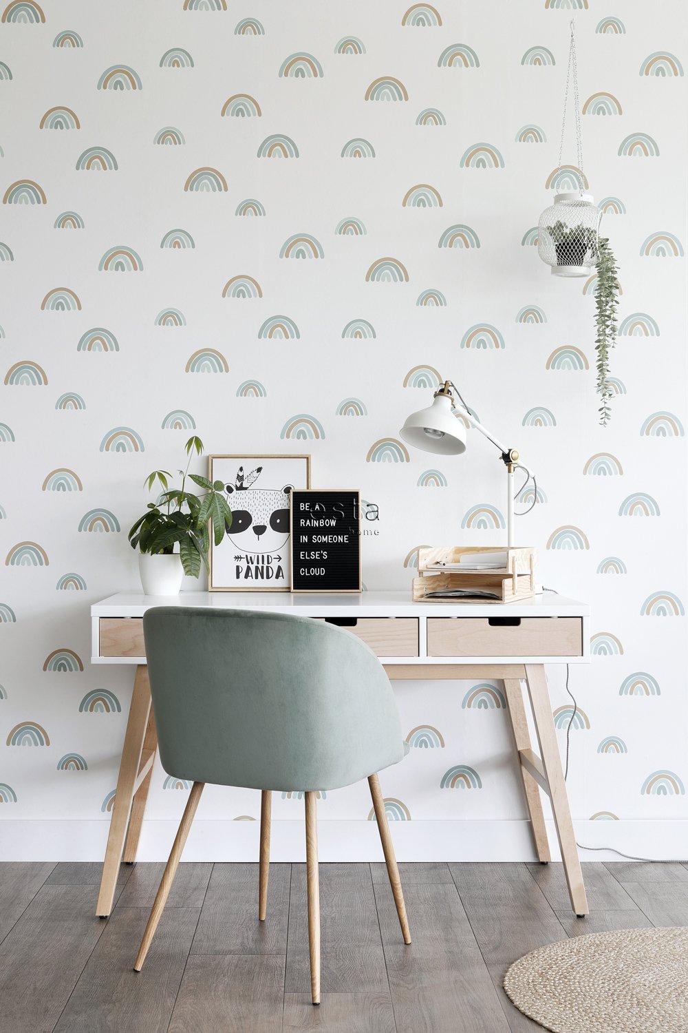 Har du någonsin sett något så gulligt? Den här gulliga tapeten med regnbågar i vintage gråblått, ljusblått och beige ger en varm, glad och livfull stämning i barnrummet. Släpp loss din och dina barns fantasi och skapa ett fantastiskt rum att drömma och leka i.