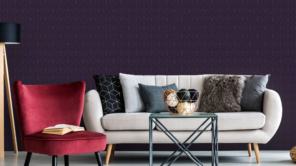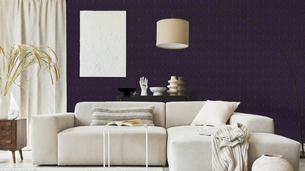 Happy Skulls är en tapet som verkligen sticker ut från mängden. Med sitt lekfulla mönster av leende dödskallar i svart eller purpur är det en tapet som verkligen utstrålar en tuff attityd. Men trots det morbidt klingande temat är det en tapet som faktiskt kan göra en glad.