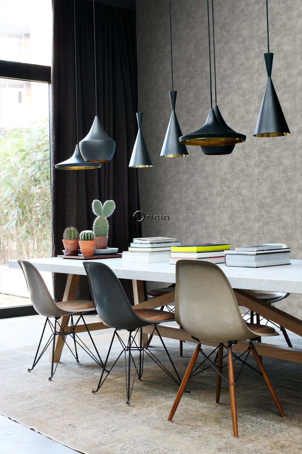 Denna tapet med betonglook i mörkgrått passar perfekt om du vill skapa en industriell look och ge ditt rum en personlig karaktär. Det industriella stilen handlar om att skapa ett tuff, grov look med hjälp av byggnadsmaterial och vintageföremål som både är funktionella och snygga. Varma, neutrala färger passar i allmänhet bäst i en industriell inredning, eftersom de vanligtvis är stora och öppna. Med plyschsoffor, utspridda kuddar och mattor som kontrasterar mot den moderna industriella dekoren, skapar man en visuell balans.