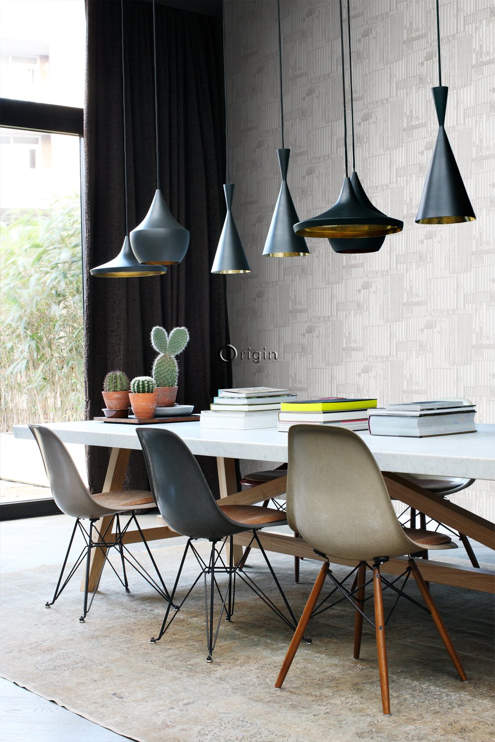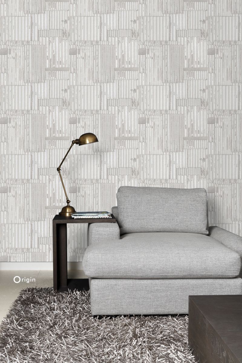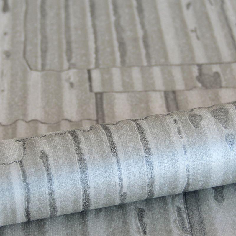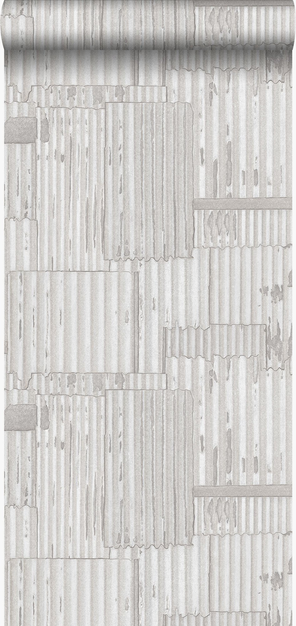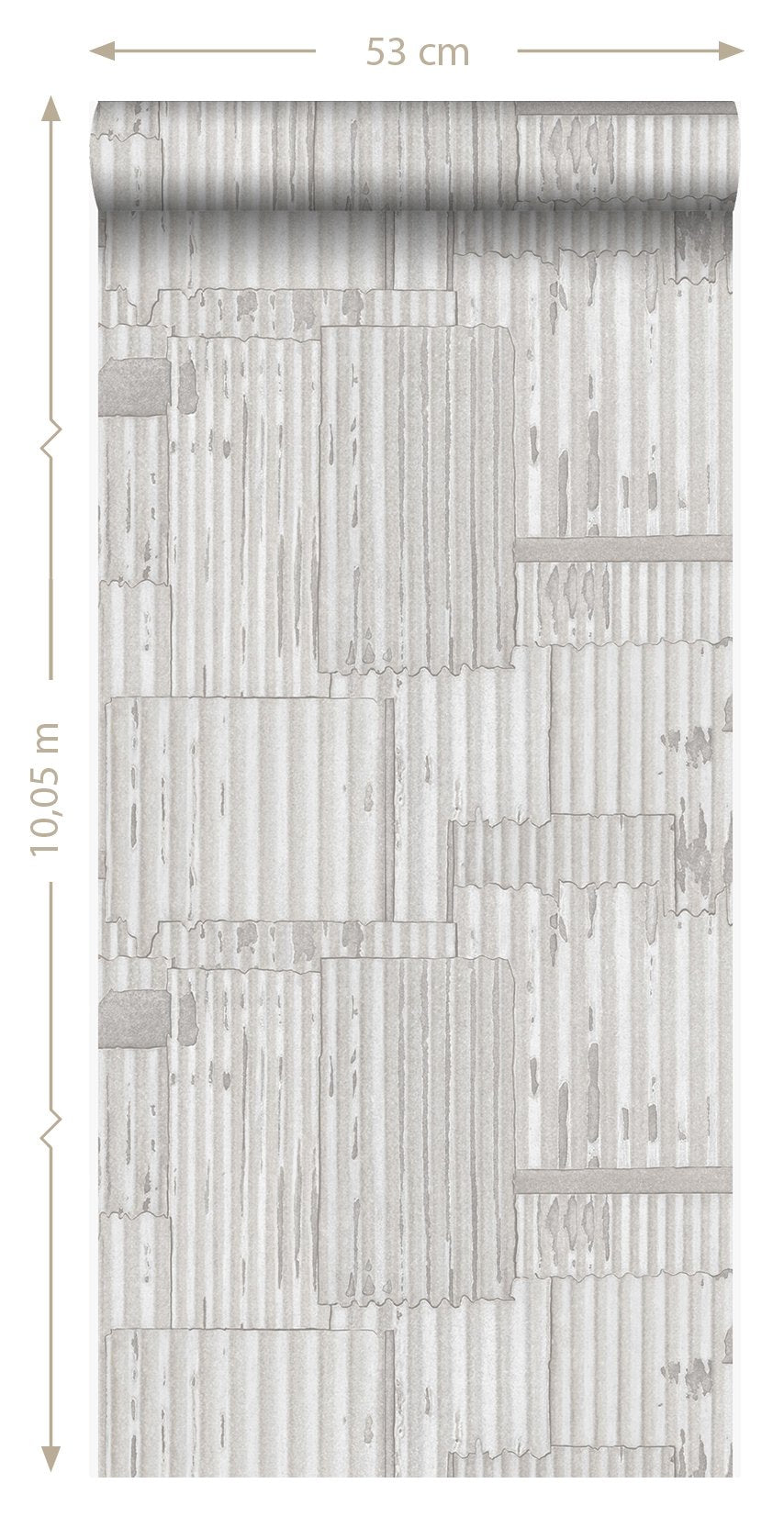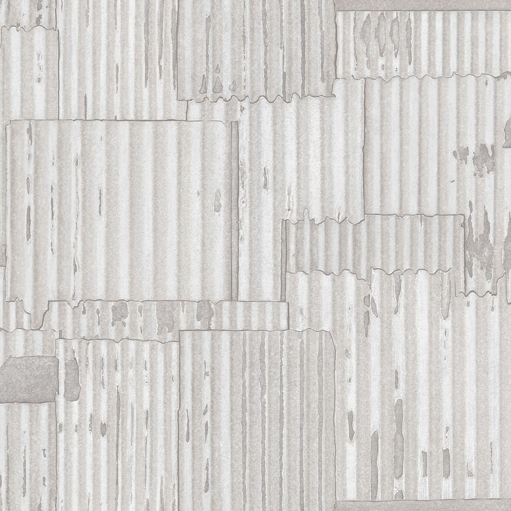 Skapa en effektfull vägg eller betona ett arkitektoniskt inslag i interiören med den här frapperande tapetdesignen med industriell korrugerad plåt i benfärgat. De glänsande metallinslagen ger tapeten en extraordinär och lyxig utstrålning.