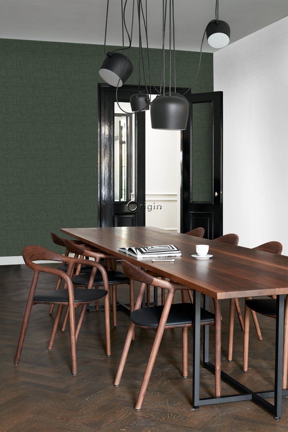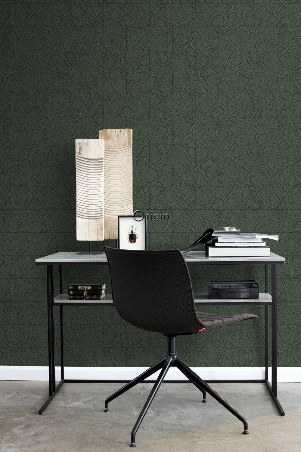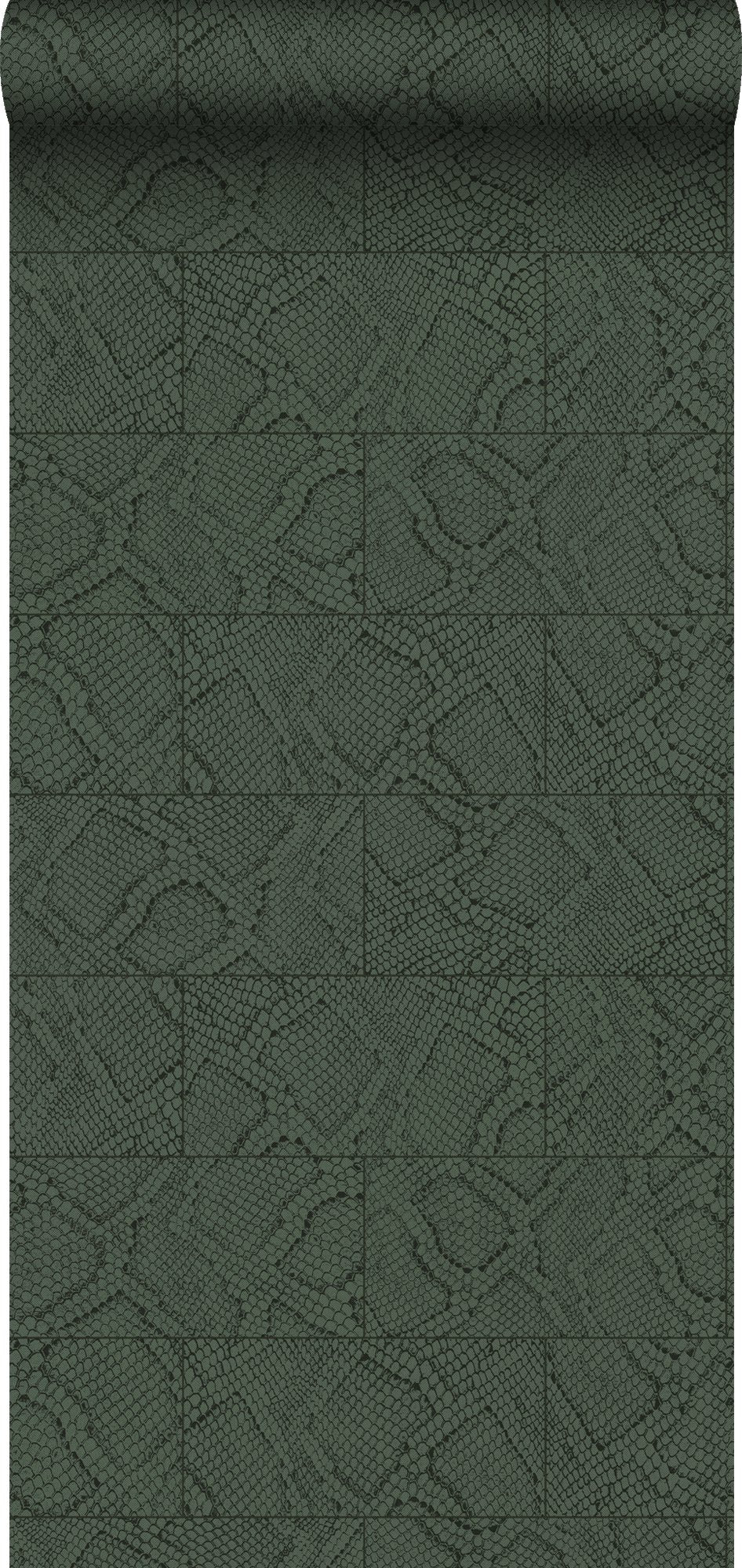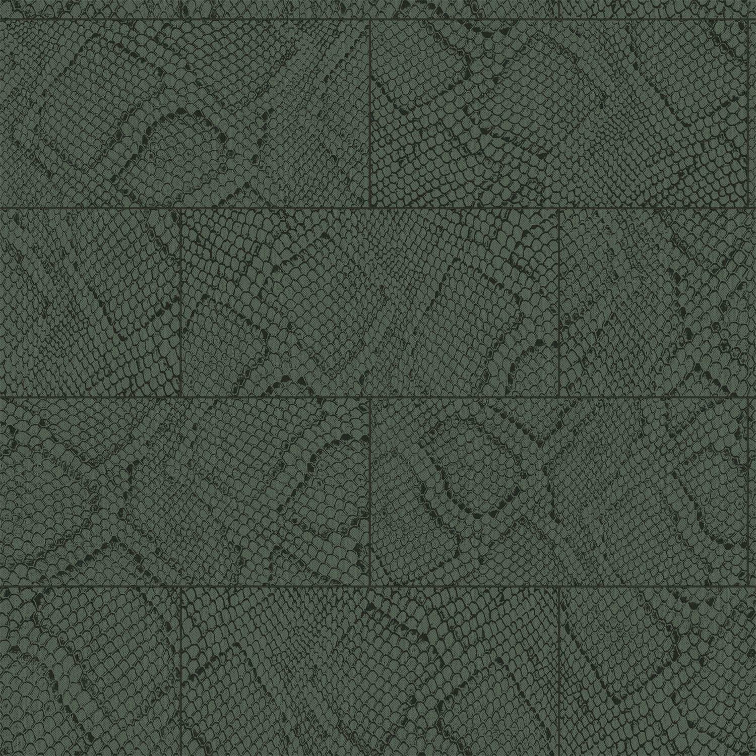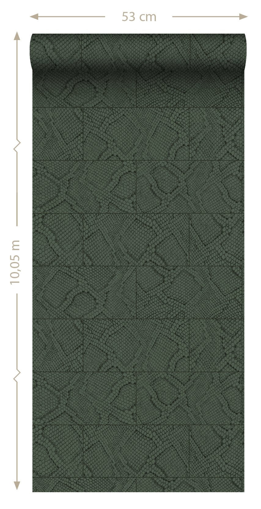 Ge din interiör en exotisk touch med det här fantastiska tapetmönstret. Den här stilfulla tapeten med ett ormskinnsmönster i mörkgrönt har en vacker, matt yta och den passar perfekt om du vill skapa en imponerande fondvägg.