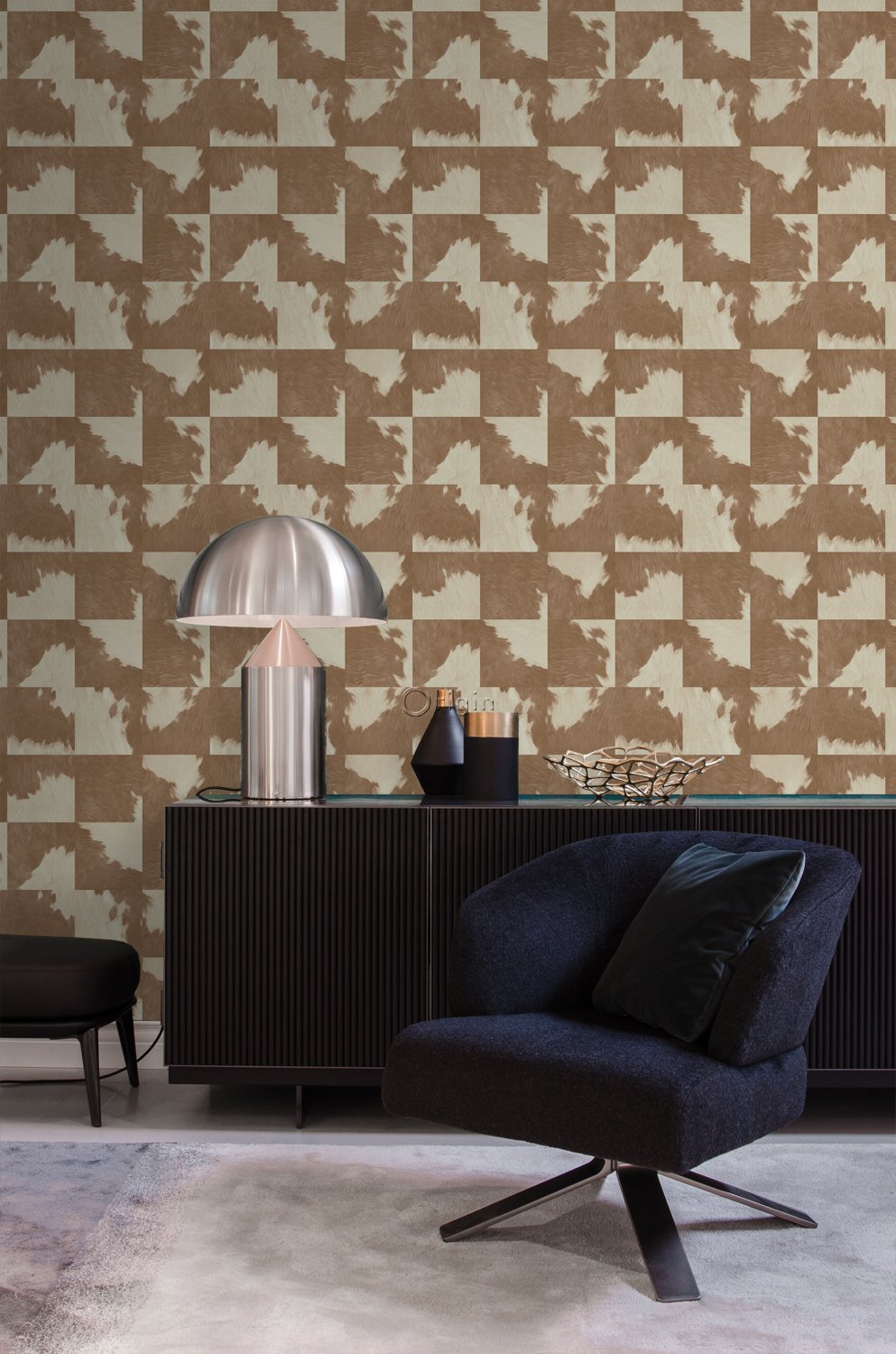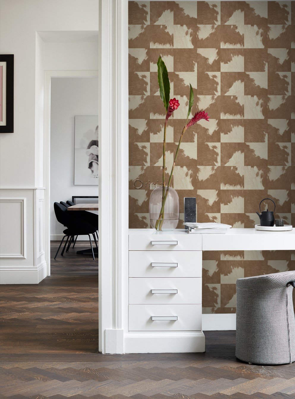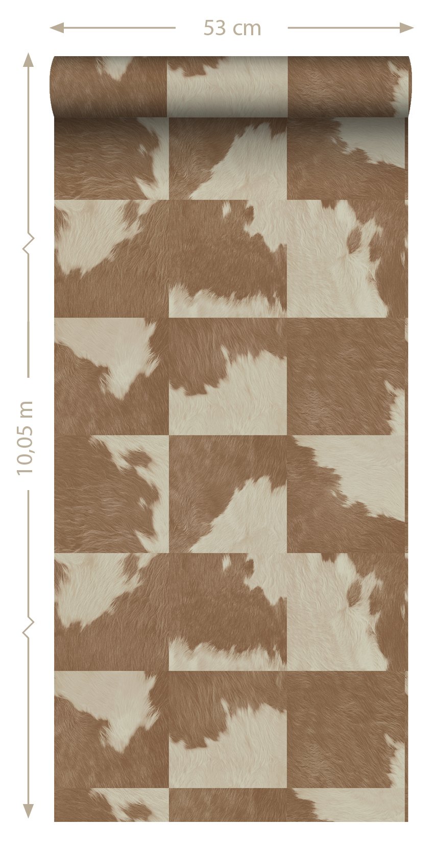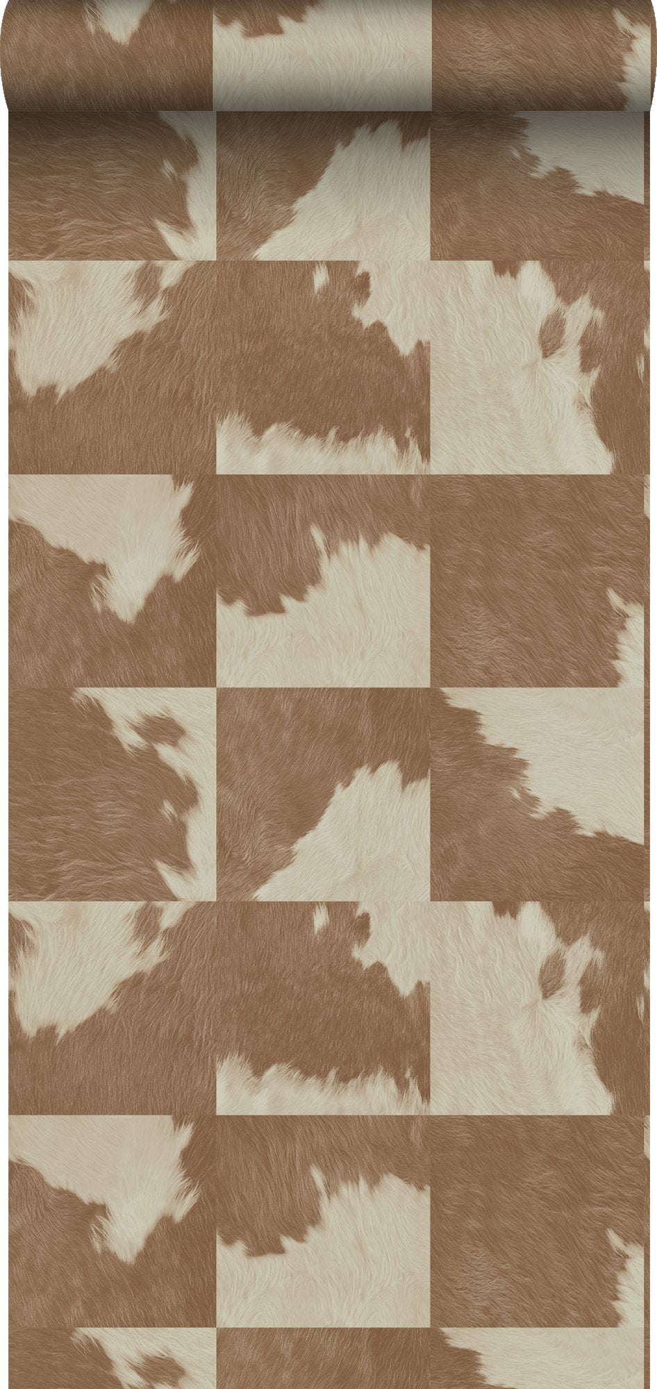 Smycka dina väggar med denna eleganta, iögonenfallande tapet med kohud look i brunt och vitt. Denna tapet med ett vackert, matt ytmönster passar perfekt till en stilfull fondvägg i en modern interiör.