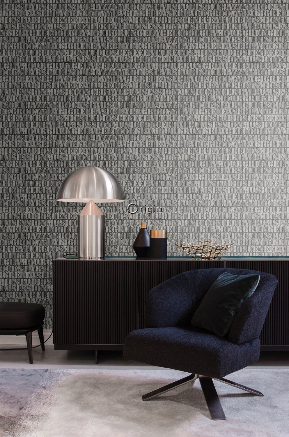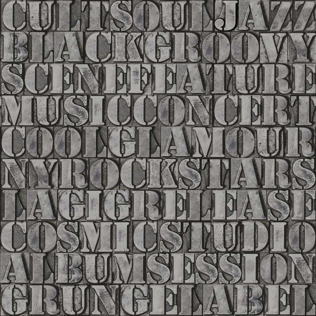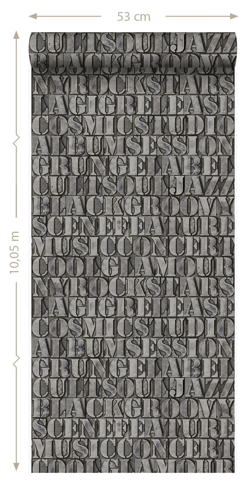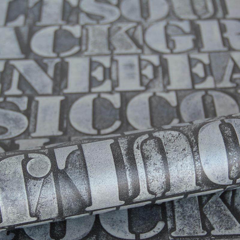 Skapa en effektfull vägg eller betona ett arkitektoniskt inslag i interiören med den här frapperande tapetdesignen med gamla metalltryckta bokstäver i mörkgrått. De glänsande metallinslagen ger tapeten en extraordinär och lyxig utstrålning.
