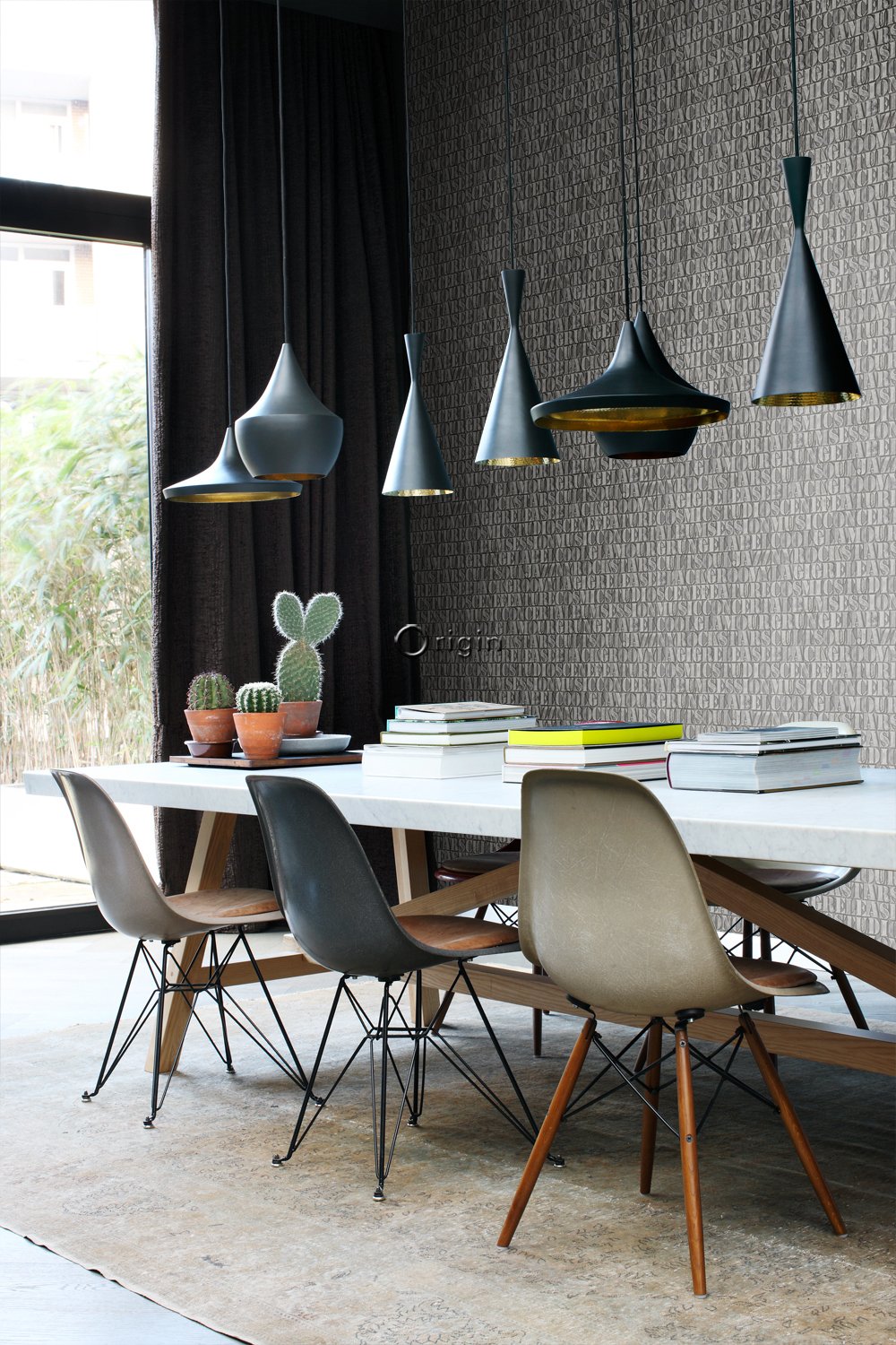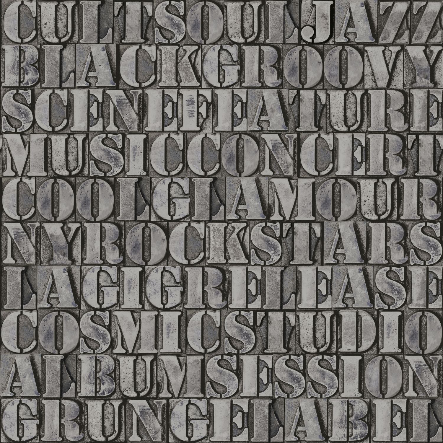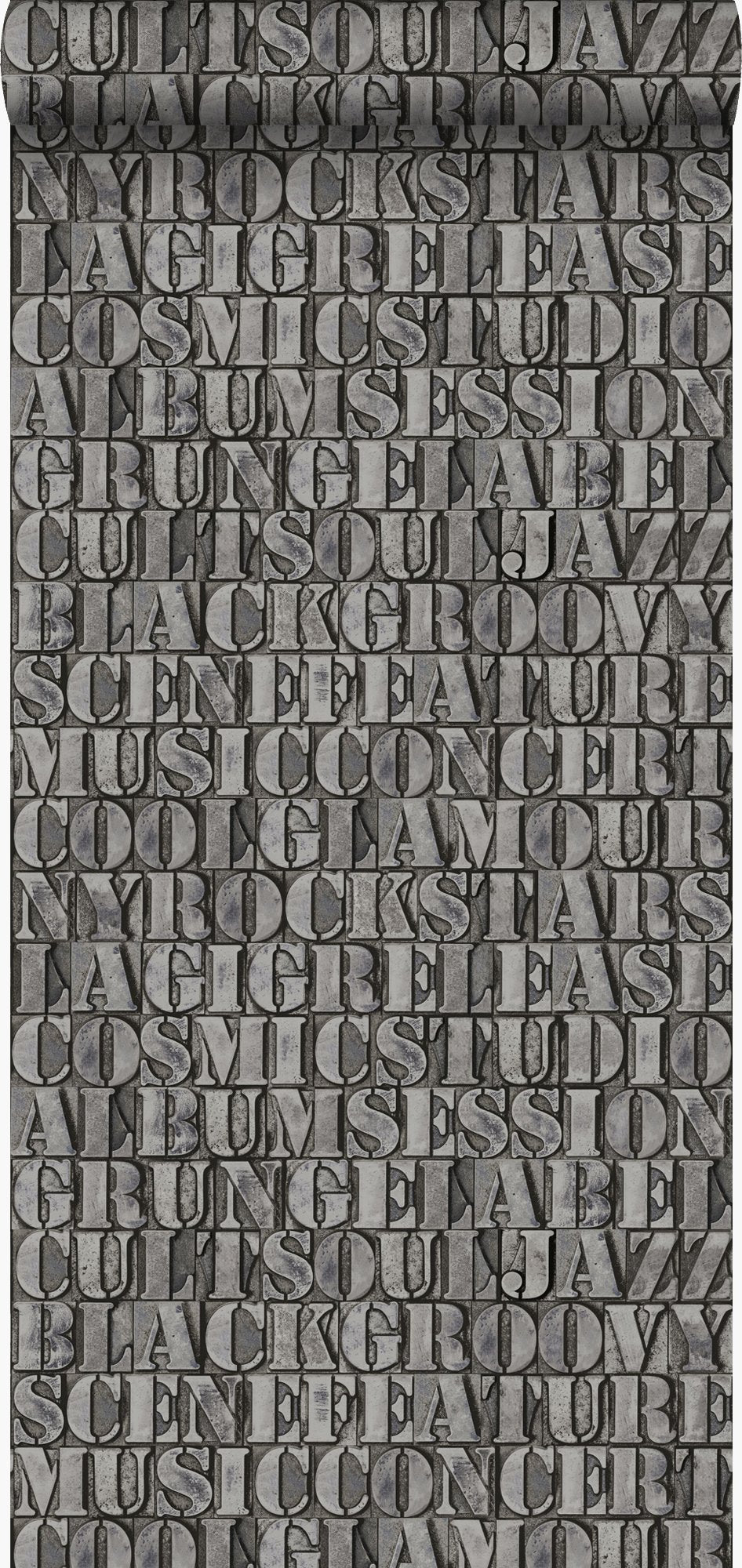 Skapa en effektfull vägg eller betona ett arkitektoniskt inslag i interiören med den här frapperande tapetdesignen med gamla metalltryckta bokstäver i mörkgrått. De glänsande metallinslagen ger tapeten en extraordinär och lyxig utstrålning.