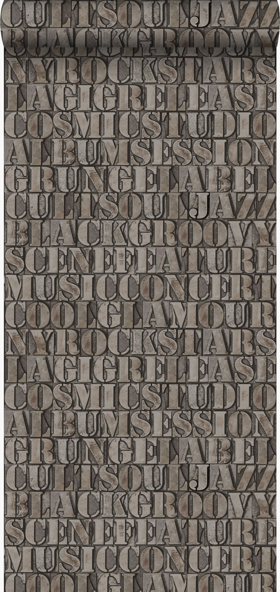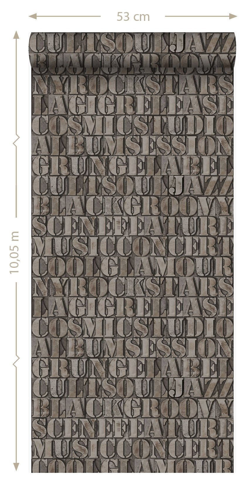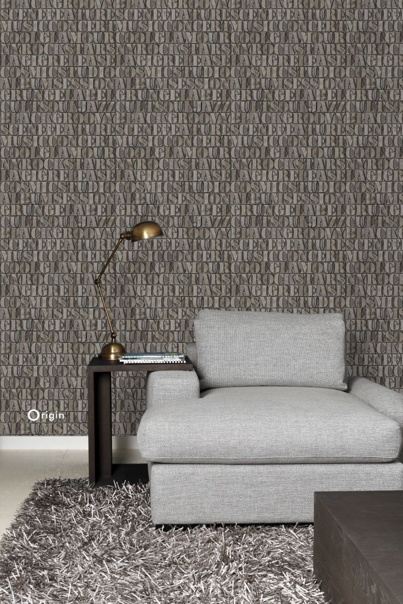 Skapa en effektfull vägg eller betona ett arkitektoniskt inslag i interiören med den här frapperande tapetdesignen med gamla metalltryckta bokstäver i rostbrunt. De glänsande metallinslagen ger tapeten en extraordinär och lyxig utstrålning.
