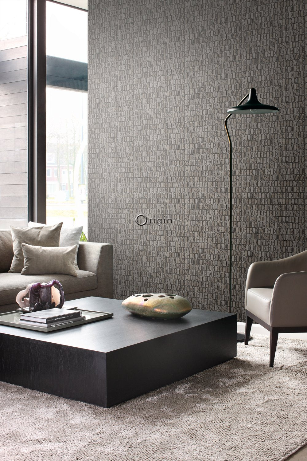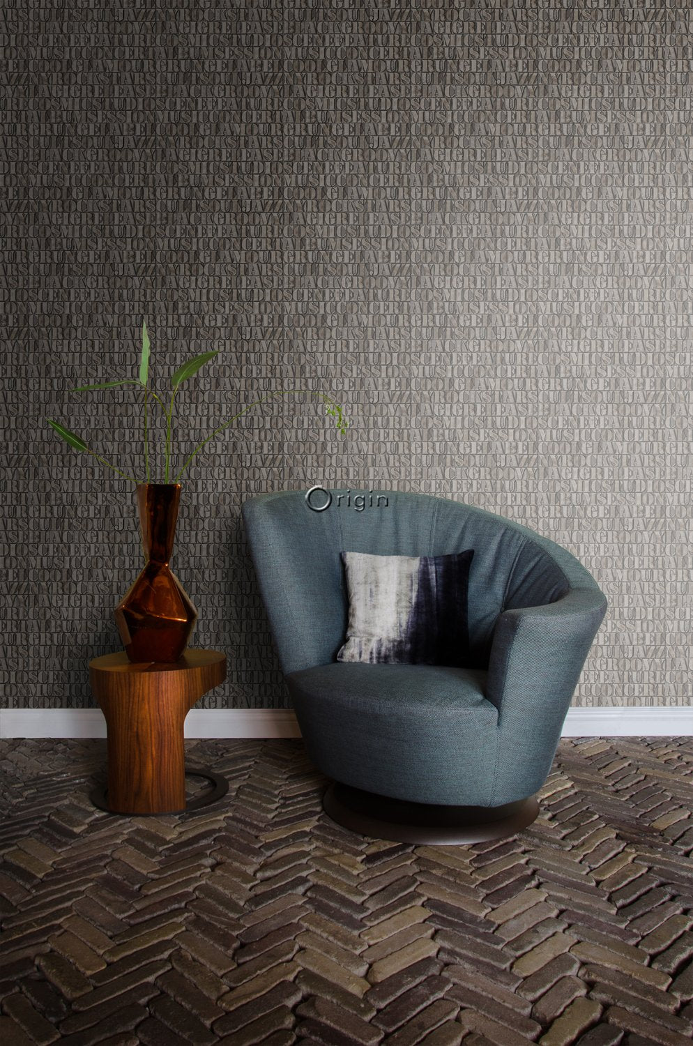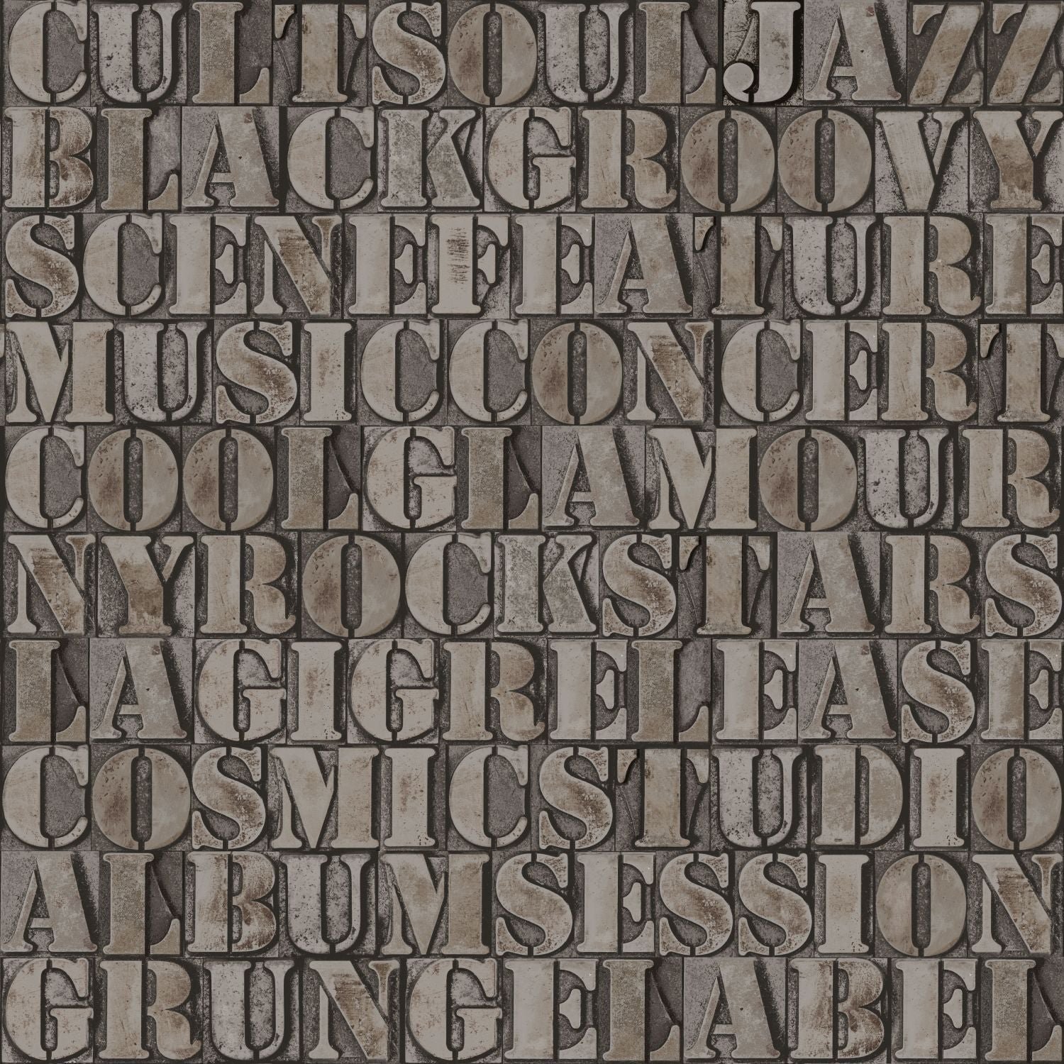 Skapa en effektfull vägg eller betona ett arkitektoniskt inslag i interiören med den här frapperande tapetdesignen med gamla metalltryckta bokstäver i rostbrunt. De glänsande metallinslagen ger tapeten en extraordinär och lyxig utstrålning.