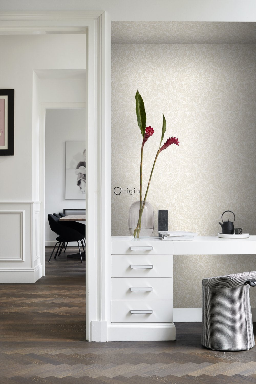 Smycka dina väggar med denna eleganta tapet med ornament i beige. Tapeten har ett vackert matt yta och passar perfekt om du vill skapa en stilfull fondvägg i en modern-klassisk interiör. Försedd med en taktil eko-struktur utstrålar detta fantastiska mönster värme, lyx och raffinemang.