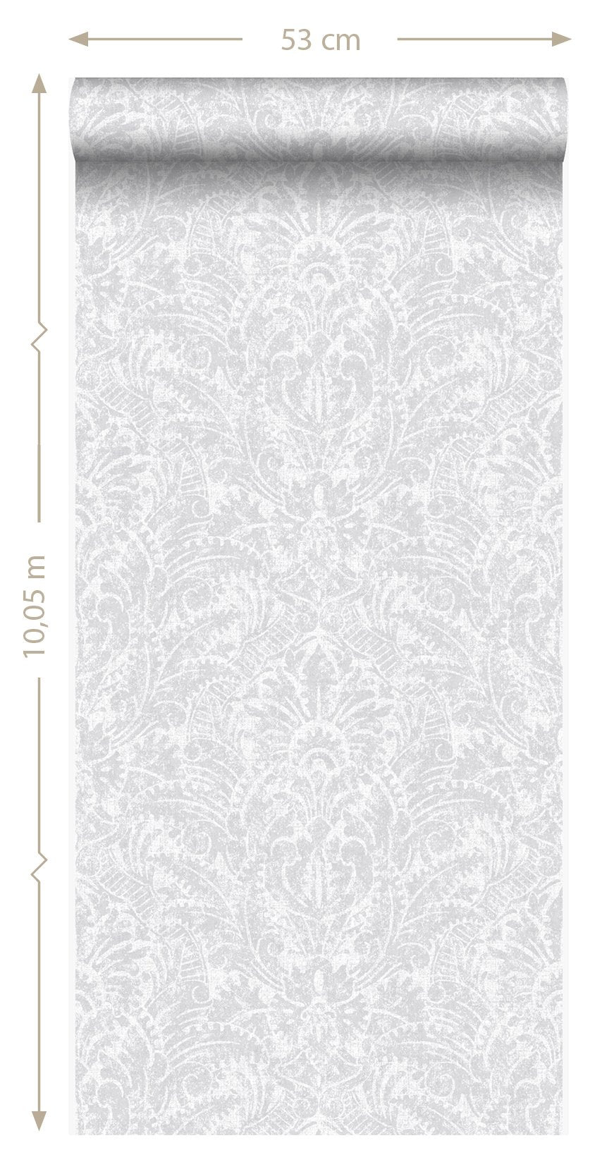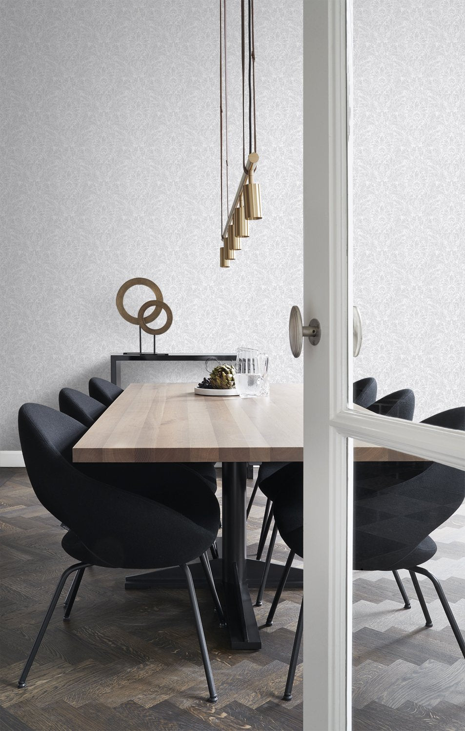 Smycka dina väggar med denna eleganta tapet med ornament i ljusgrått. Tapeten har ett vackert matt yta och passar perfekt om du vill skapa en stilfull fondvägg i en modern-klassisk interiör. Försedd med en taktil eko-struktur utstrålar detta fantastiska mönster värme, lyx och raffinemang.