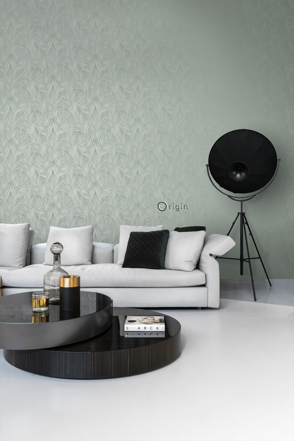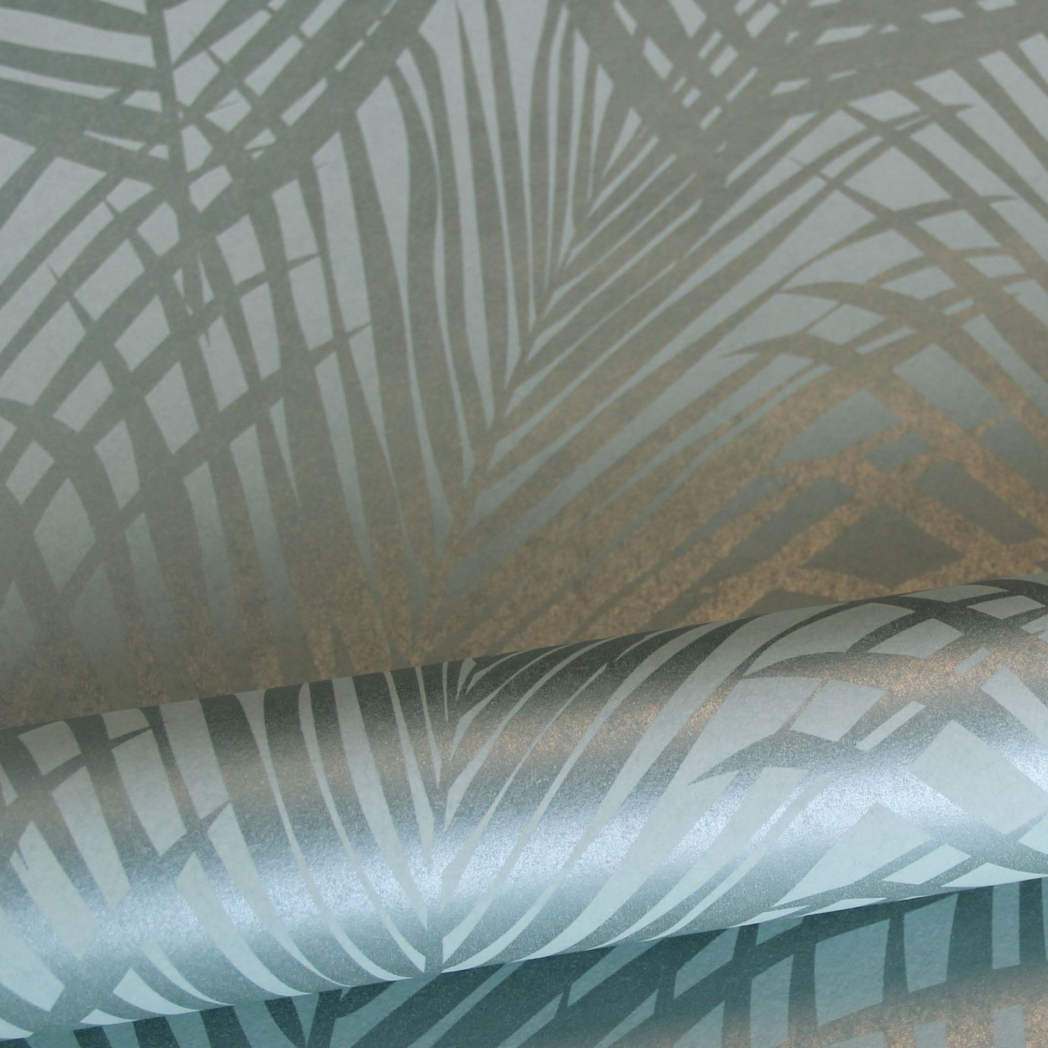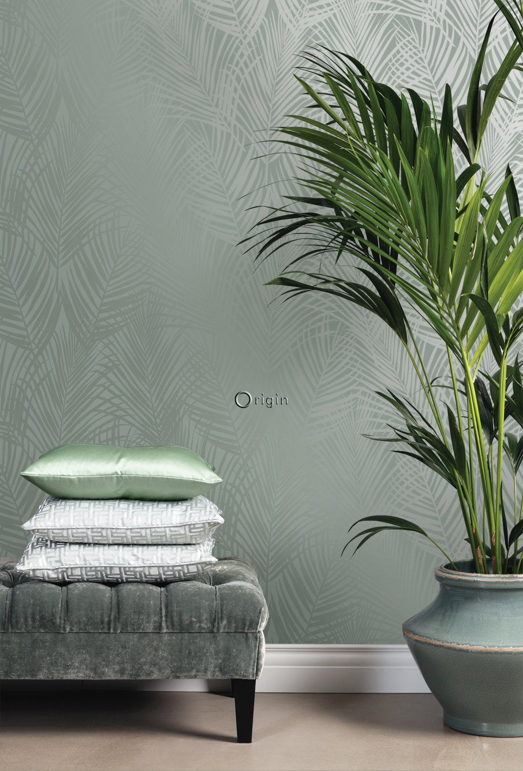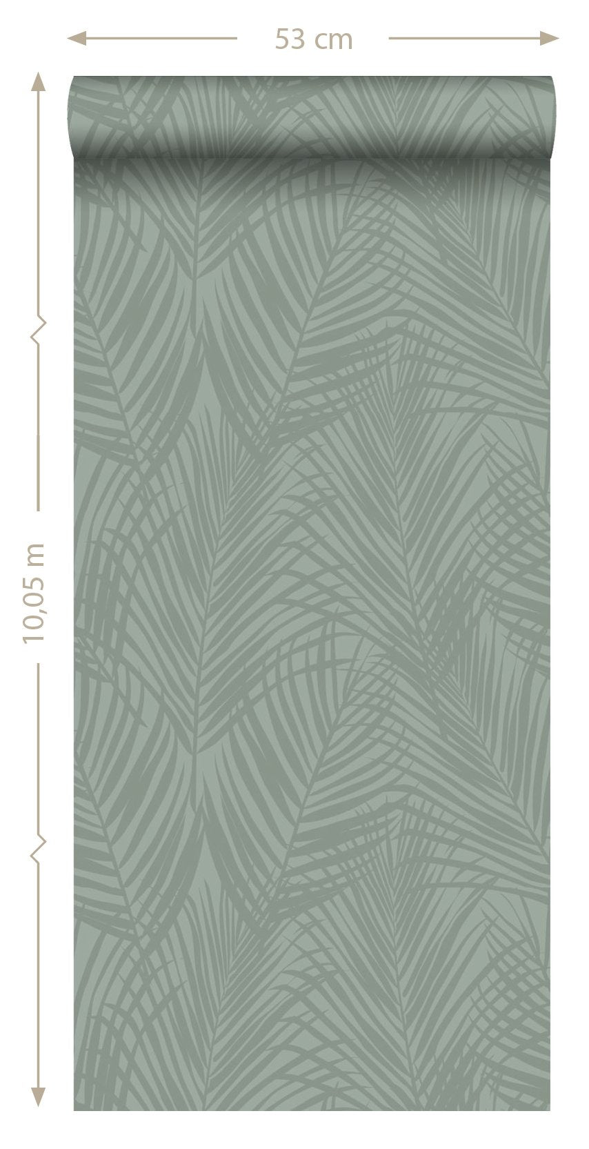Smycka dina väggar med denna eleganta, iögonenfallande tapet med palmblad i grågrönt. Den spännande kontrasten mellan det blanka motivet och den extra matta ytan skapar en livfull dynamik och gör mönstret till en fest för ögat. Perfekt för en attraktiv accentvägg och ett subtilt sätt att ge din interiör lite glamour.