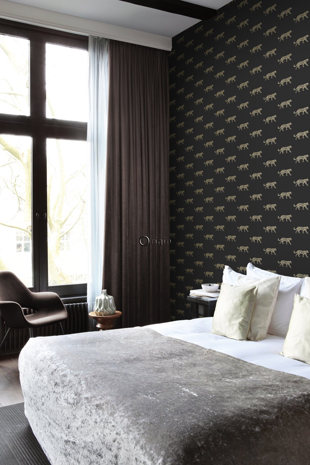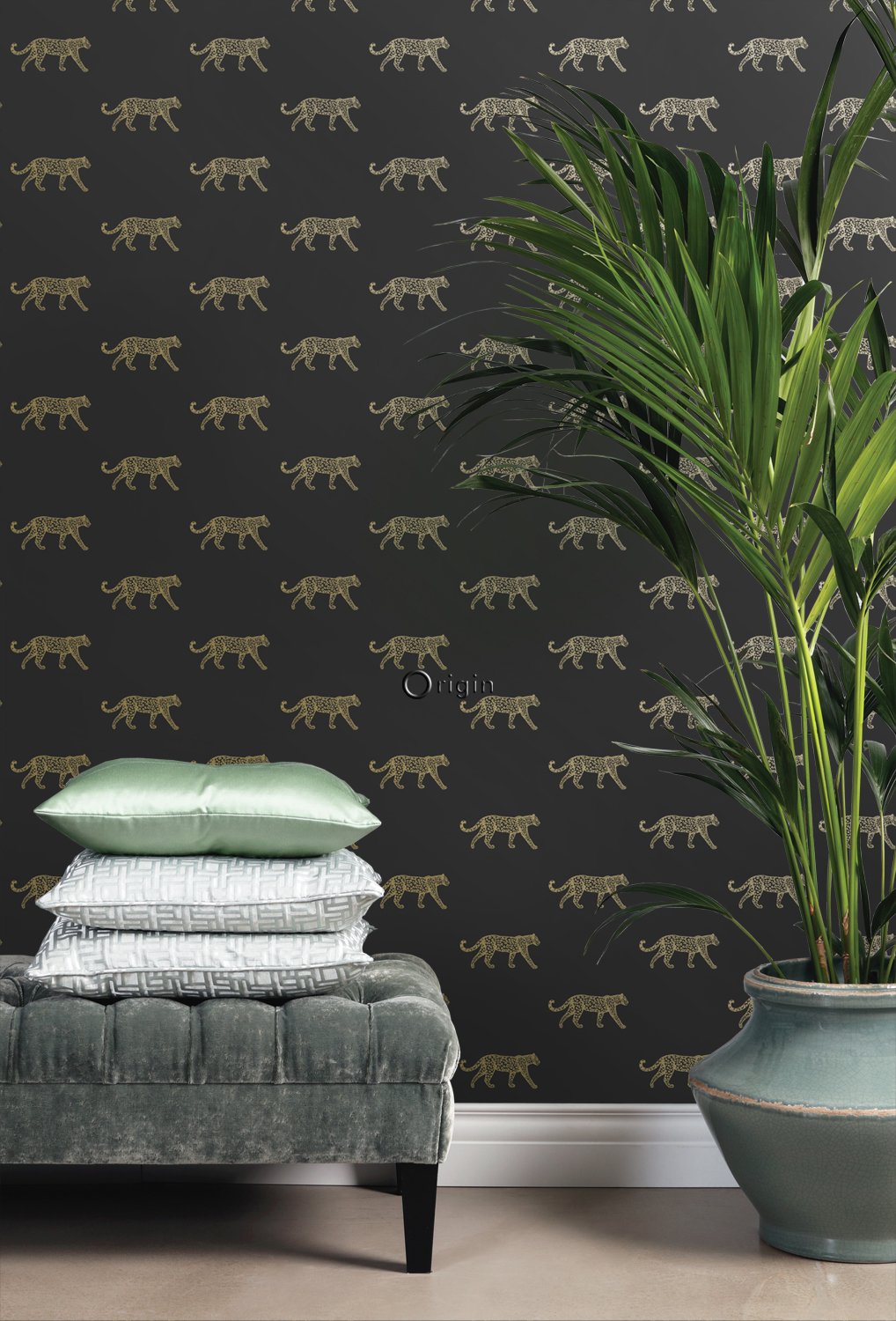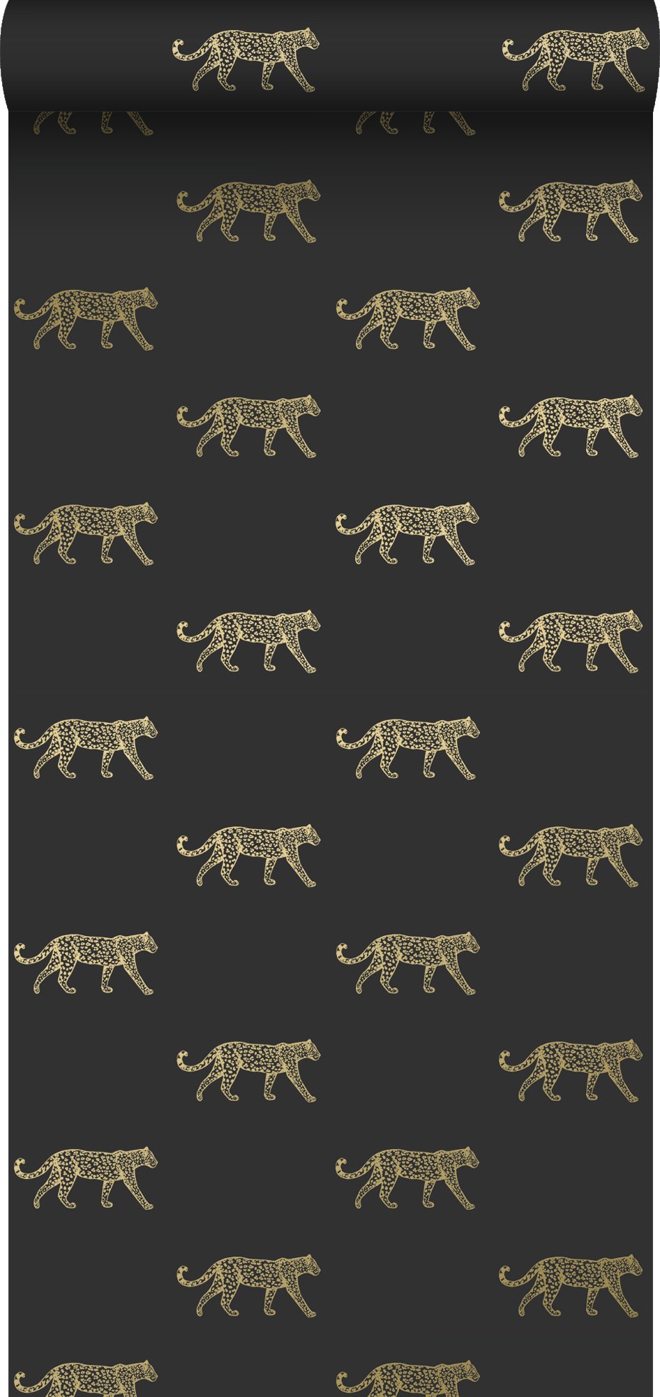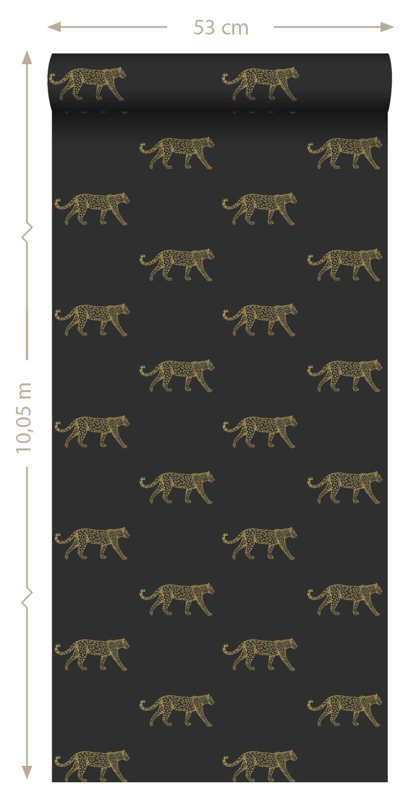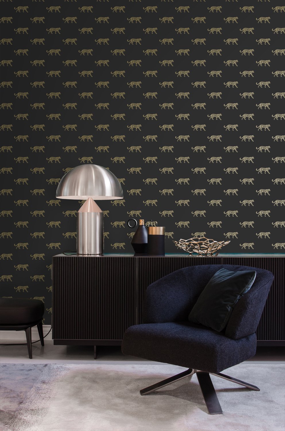 Smycka dina väggar med denna eleganta, iögonenfallande tapet med pantrar i svart och guld. Den spännande kontrasten mellan det blanka guldmönstret och den extra matta ytan skapar en livfull dynamik och gör mönstret till en fest för ögat. Perfekt för en attraktiv accentvägg och ett subtilt sätt att ge din interiör lite glamour.
