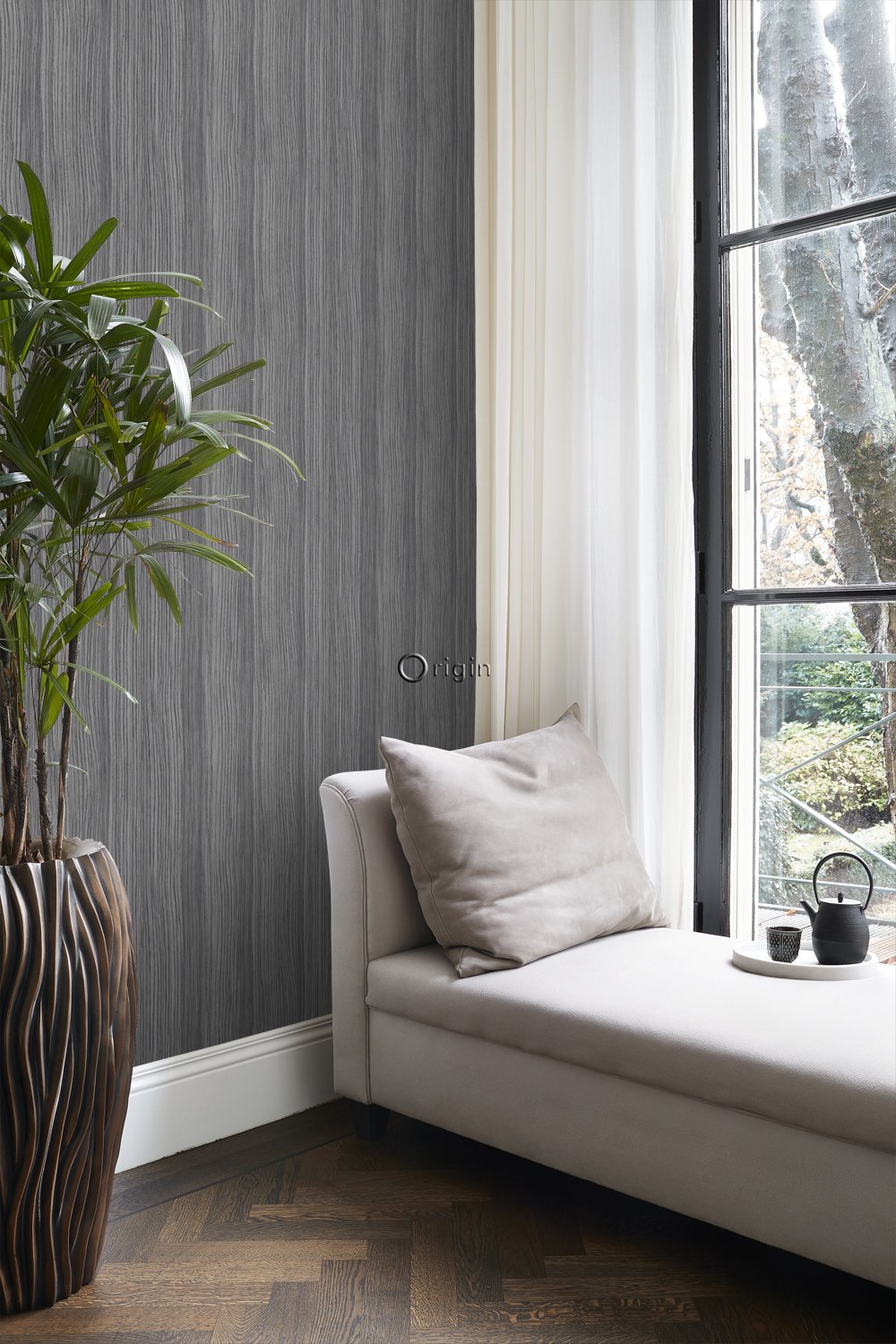 Ge ditt hem en extra naturlig touch och skapa en rustik atmosfär med den här den eleganta, naturliga tapetdesignen med ränder i mullvadsgrått. Tapeten har en vacker, matt yta och passar perfekt om du vill skapa en stilfull fondvägg. Försedd med en taktil eko-struktur utstrålar detta fantastiska mönster värme, lyx och raffinemang.