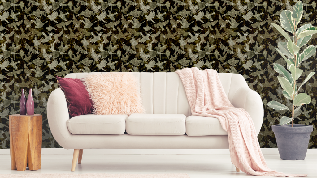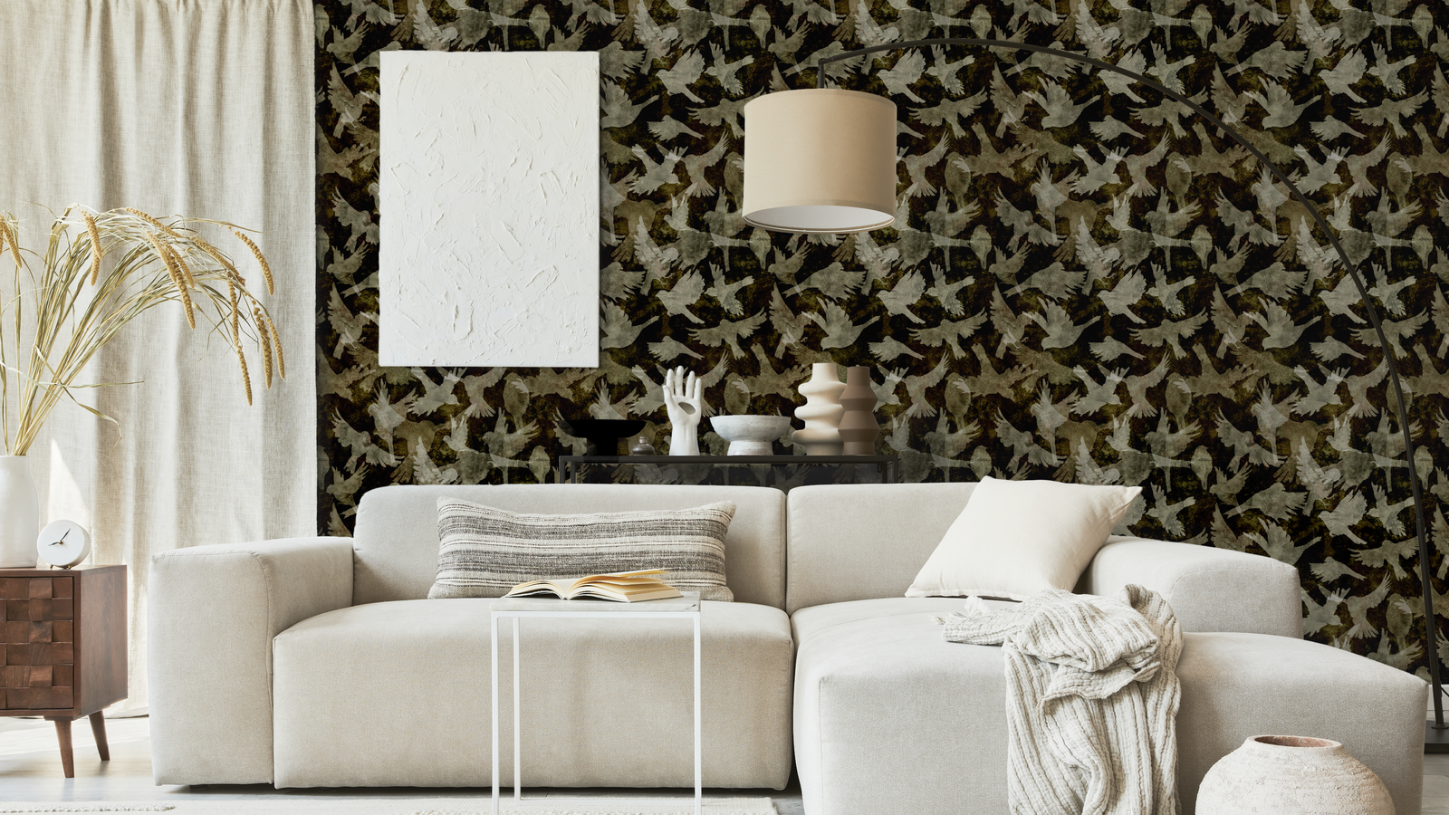Fåglar - vita som i skuggformationer mot fem olika melerade bottenfärger men lite ton i ton kulörmässigt. Ännu ett mästerverk av Malin Österberg som har potential att bli en klassiker i skandinaviska hem.