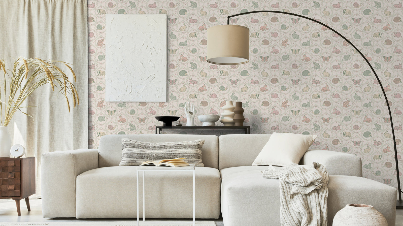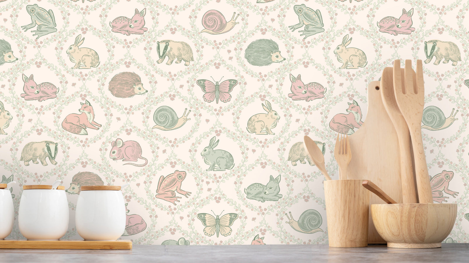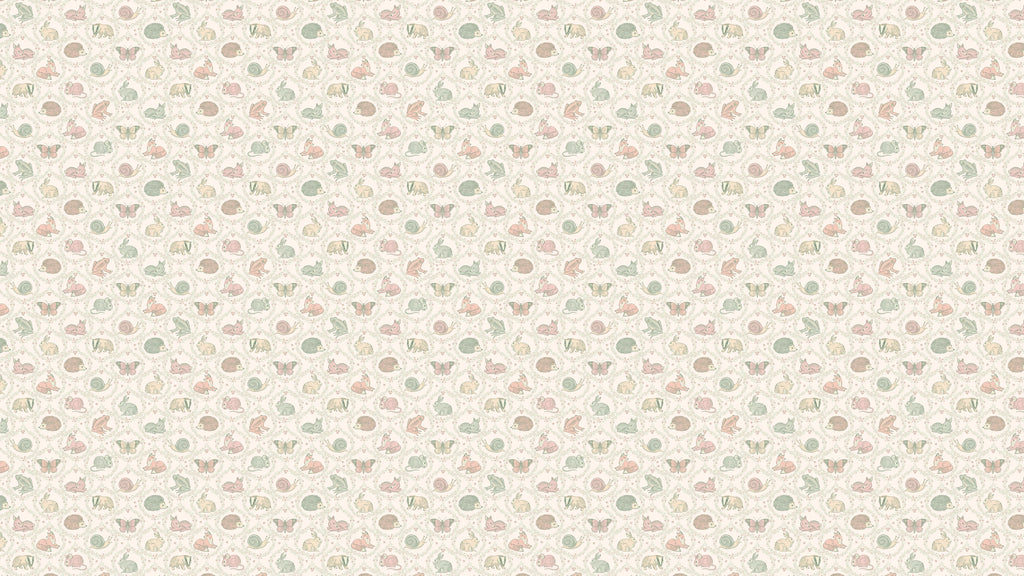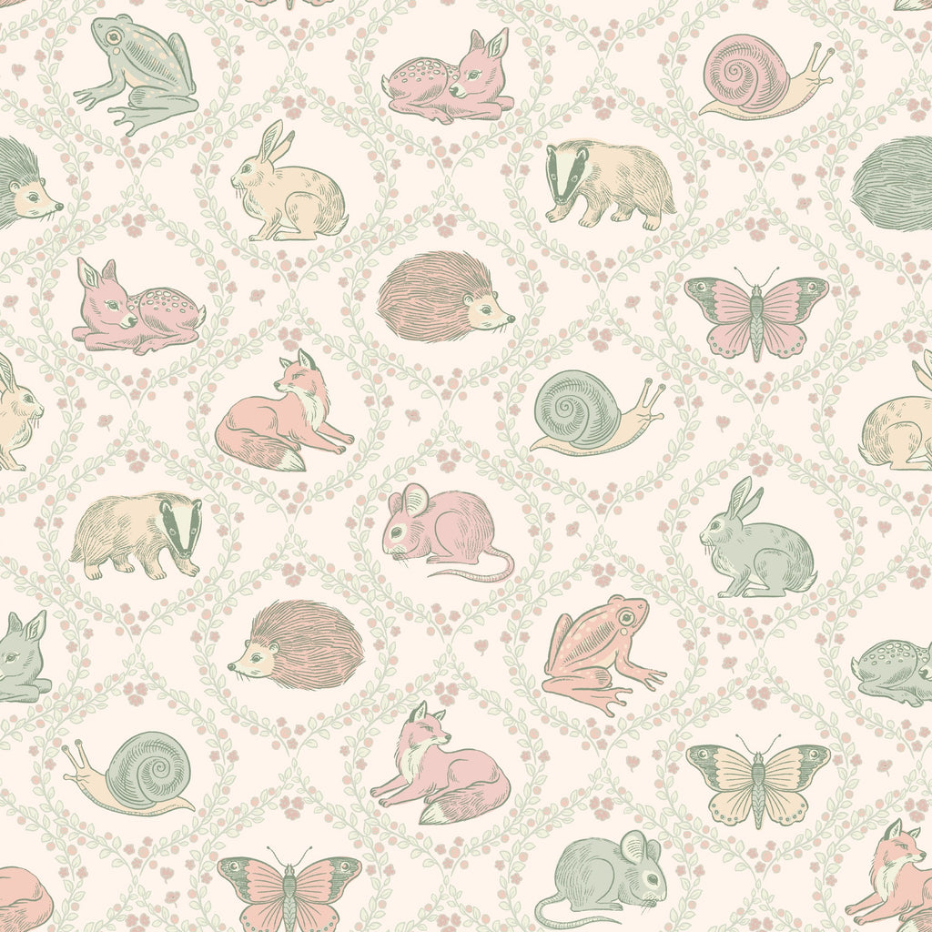 Forest Guest List Ogee är en tapet som tar dig med på en vandring genom skogen. Tapeten är fylld med illustrationer av skogens gäster som haren, skogsmusen, grävlingen, rådjurskidet, fjärilar och sniglar och så klart den listiga räven. Varje figur är inramad av en vacker lövad krans som ger en extra dimension till tapetens design.