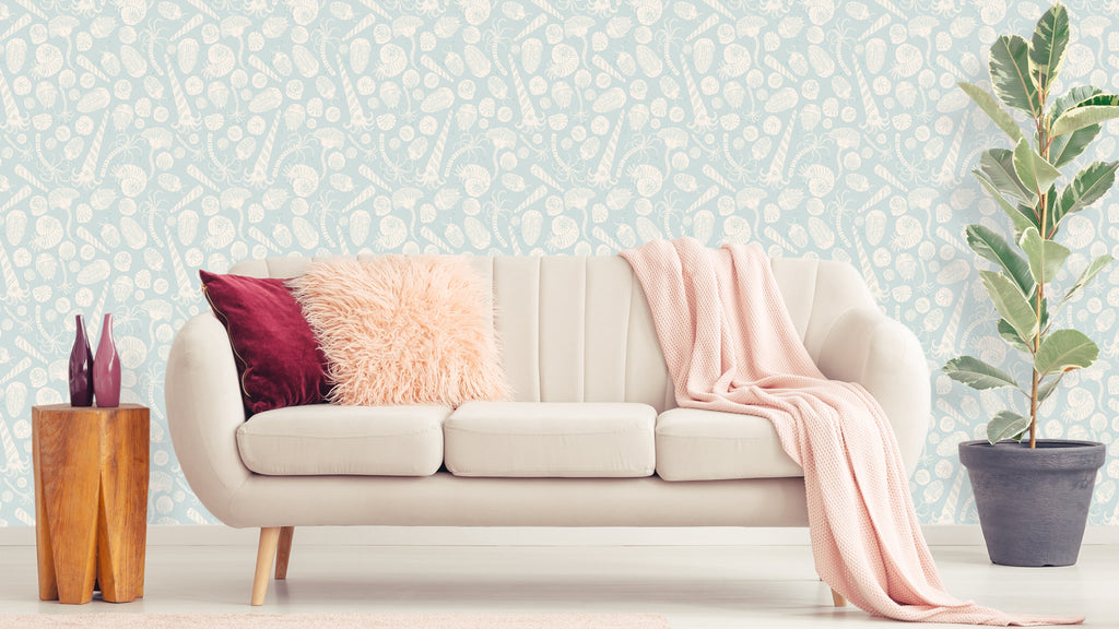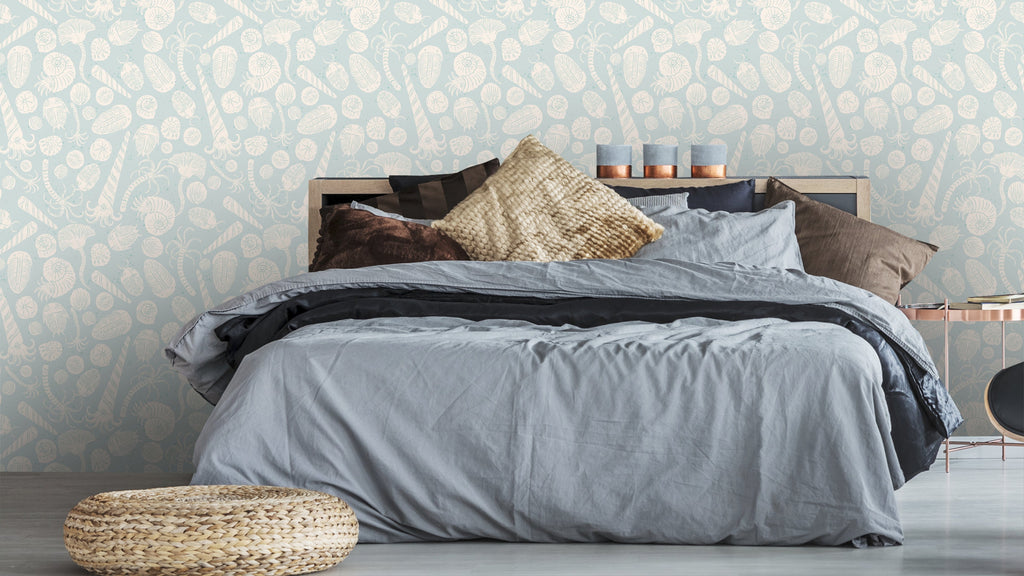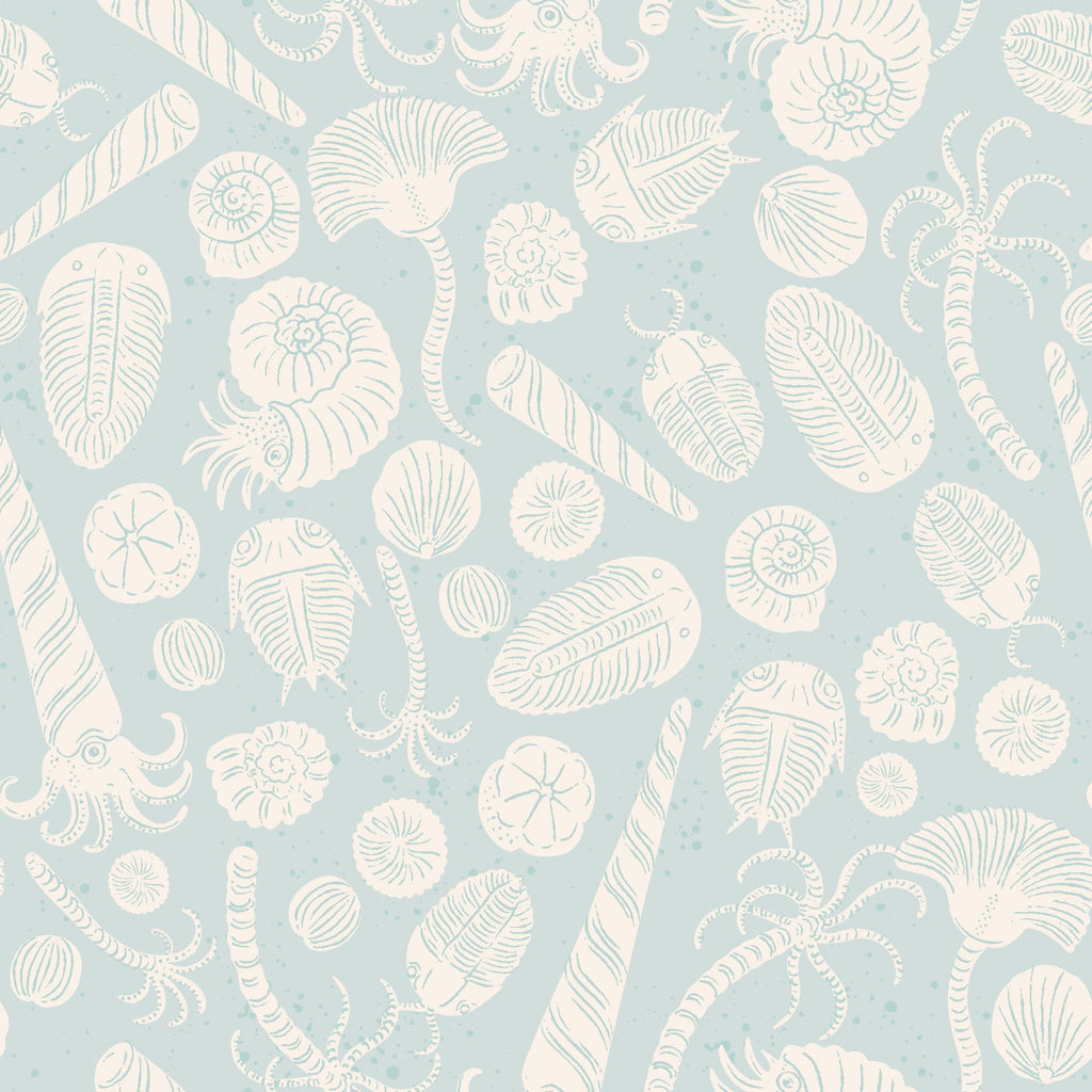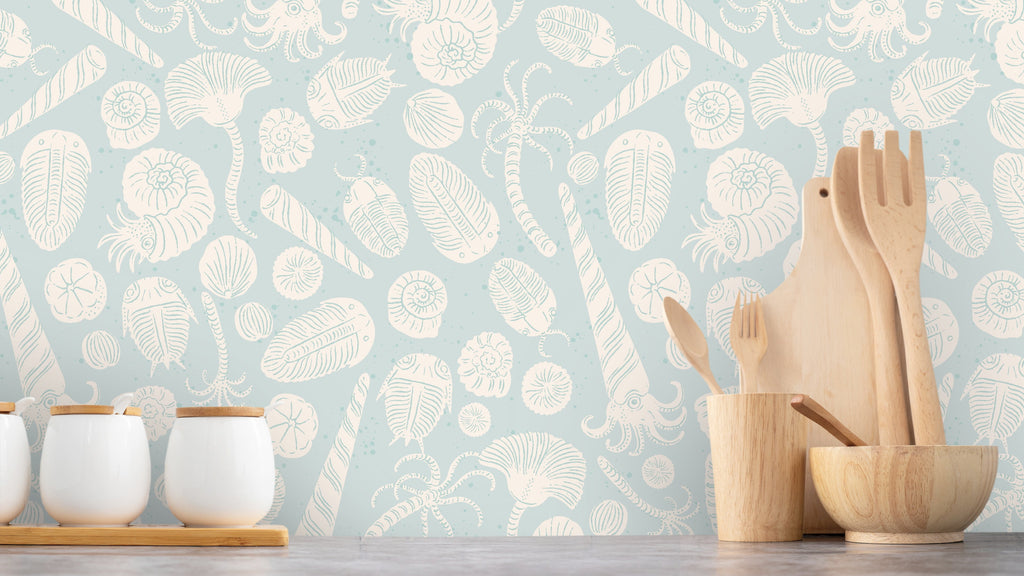 De fornhistoriska marina fossiler som avbildas på tapeten ger en känsla av tidlöshet och ger rummet en känsla av att vara en del av något större än det självt. Det är som att blicka tillbaka i tiden och se hur världen en gång såg ut.
