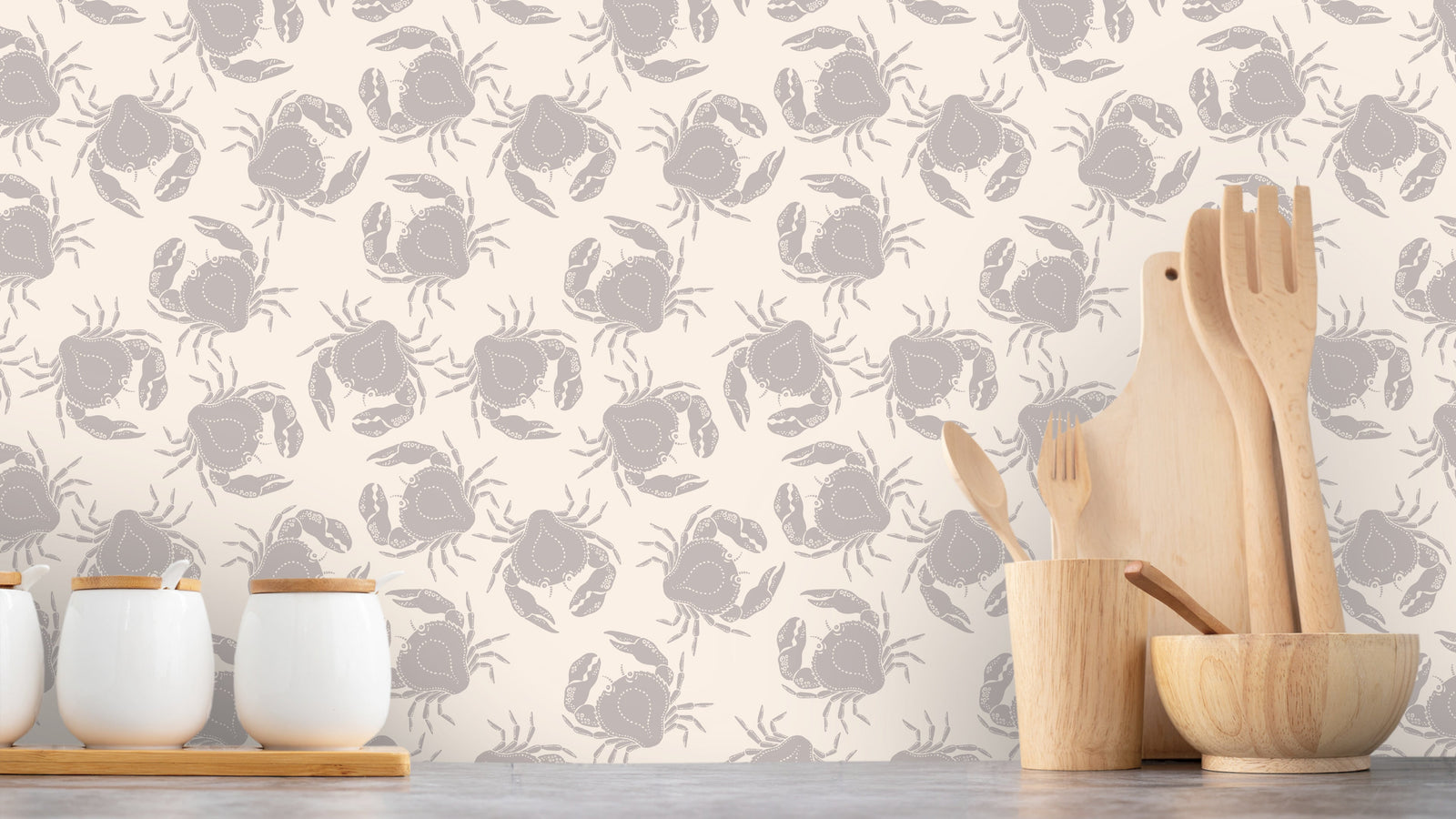 Bottenkulörerna i olika färger ger Krabba en känsla av att vara en del av havet självt. Den blåa bakgrunden för tankarna till det djupa havet, medan de mjuka bruna tonerna påminner om stranden och tidvattenpölarna. Tillsammans ger detta en tapet som är läckert som helst för att skapa ett marint tema i ditt hem.