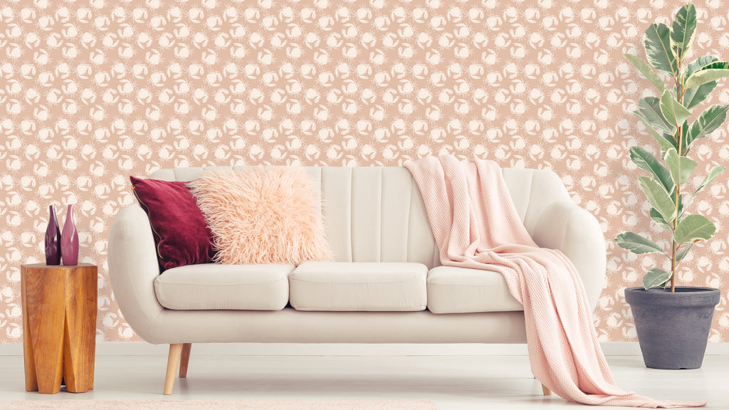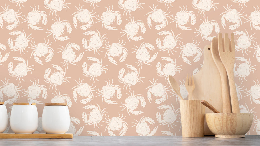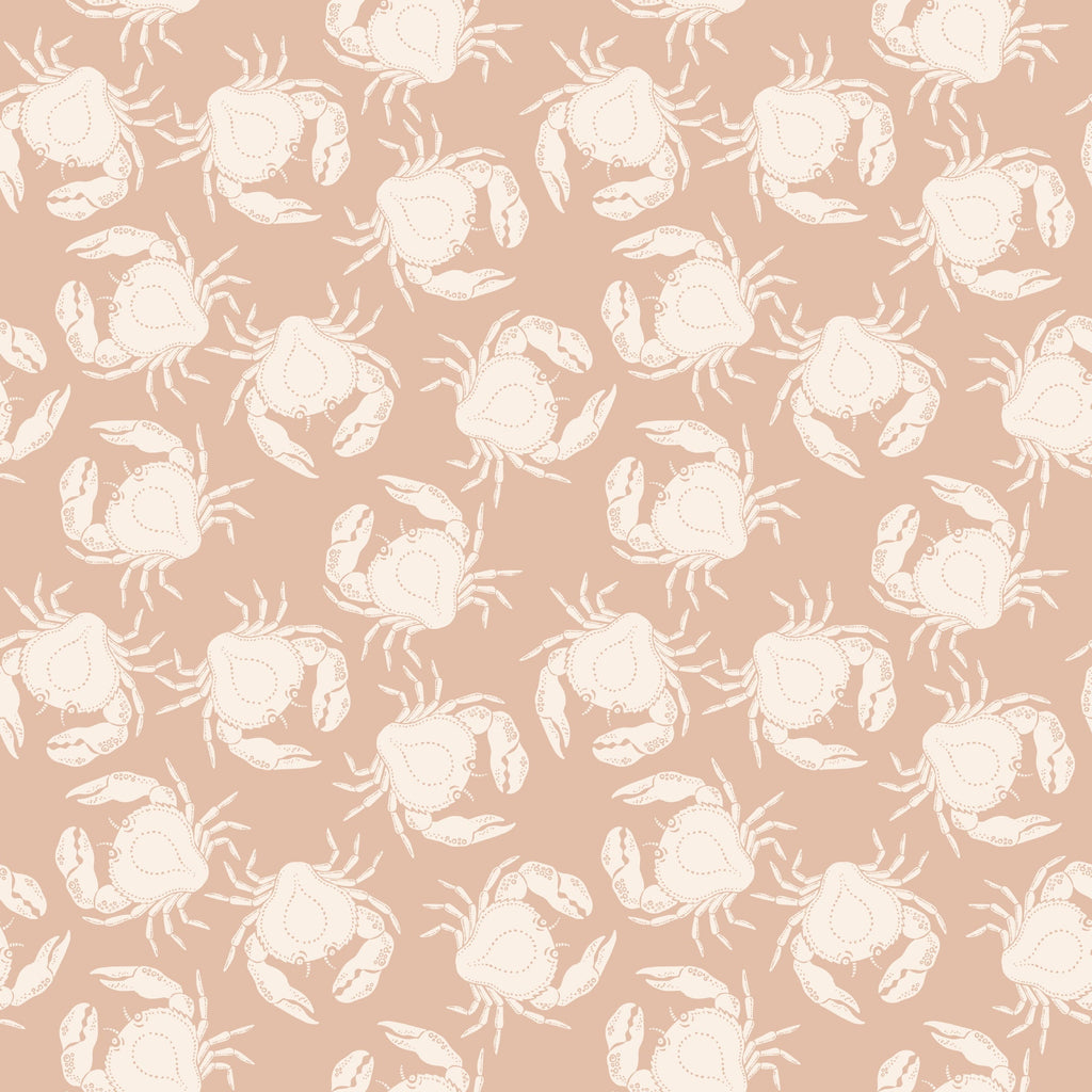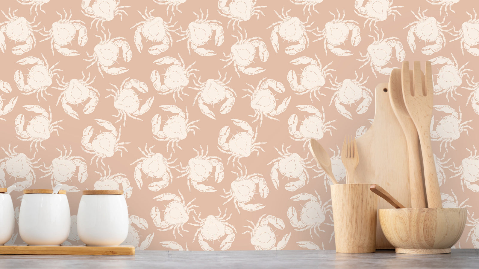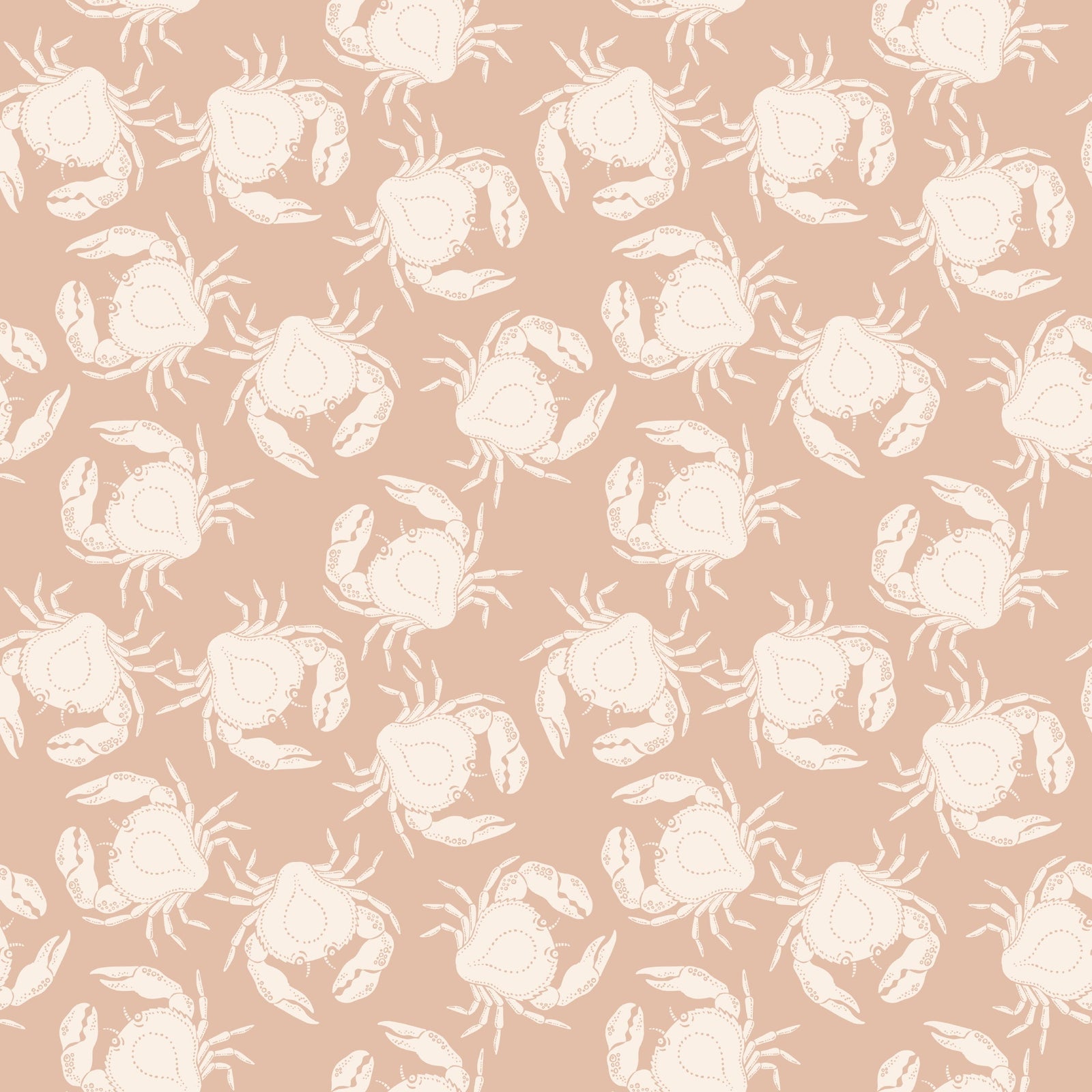Bottenkulörerna i olika färger ger Krabba en känsla av att vara en del av havet självt. Den blåa bakgrunden för tankarna till det djupa havet, medan de mjuka bruna tonerna påminner om stranden och tidvattenpölarna. Tillsammans ger detta en tapet som är läckert som helst för att skapa ett marint tema i ditt hem.