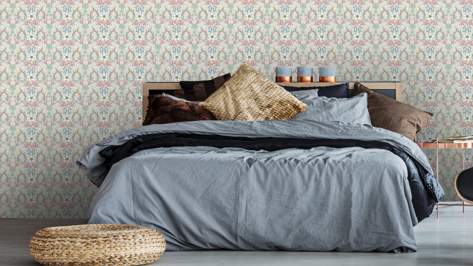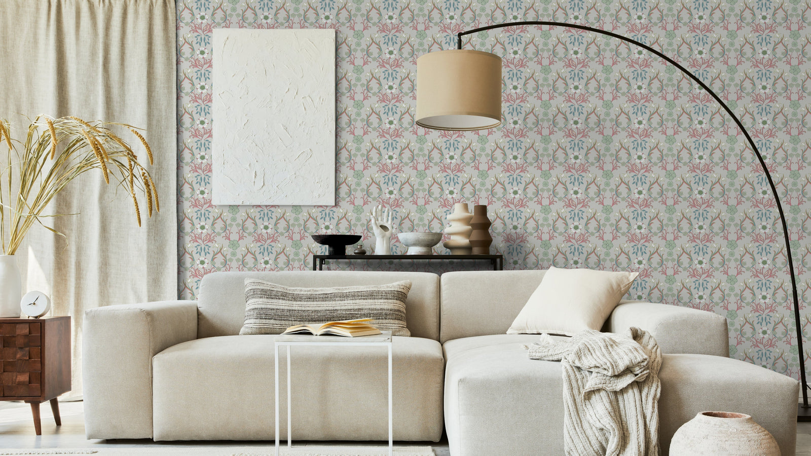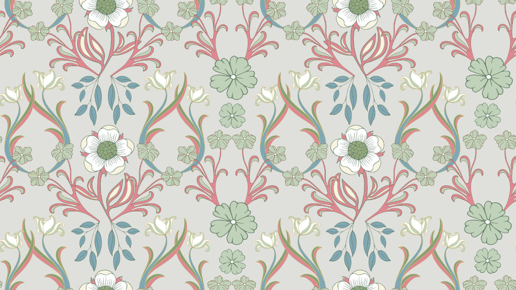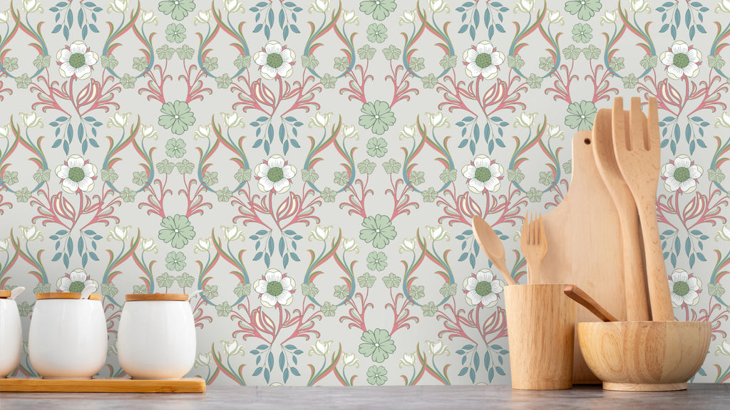 De mjuka färgerna som används på tapeten ger ett intryck av fridfullhet och lugn. Rosorna är målade i en mjuk rosa färg som ger ett romantiskt och feminint intryck. Lavendeln har en lila nyans som ger en avkopplande och lugnande känsla och gröna blad ger en känsla av harmoni och balans.